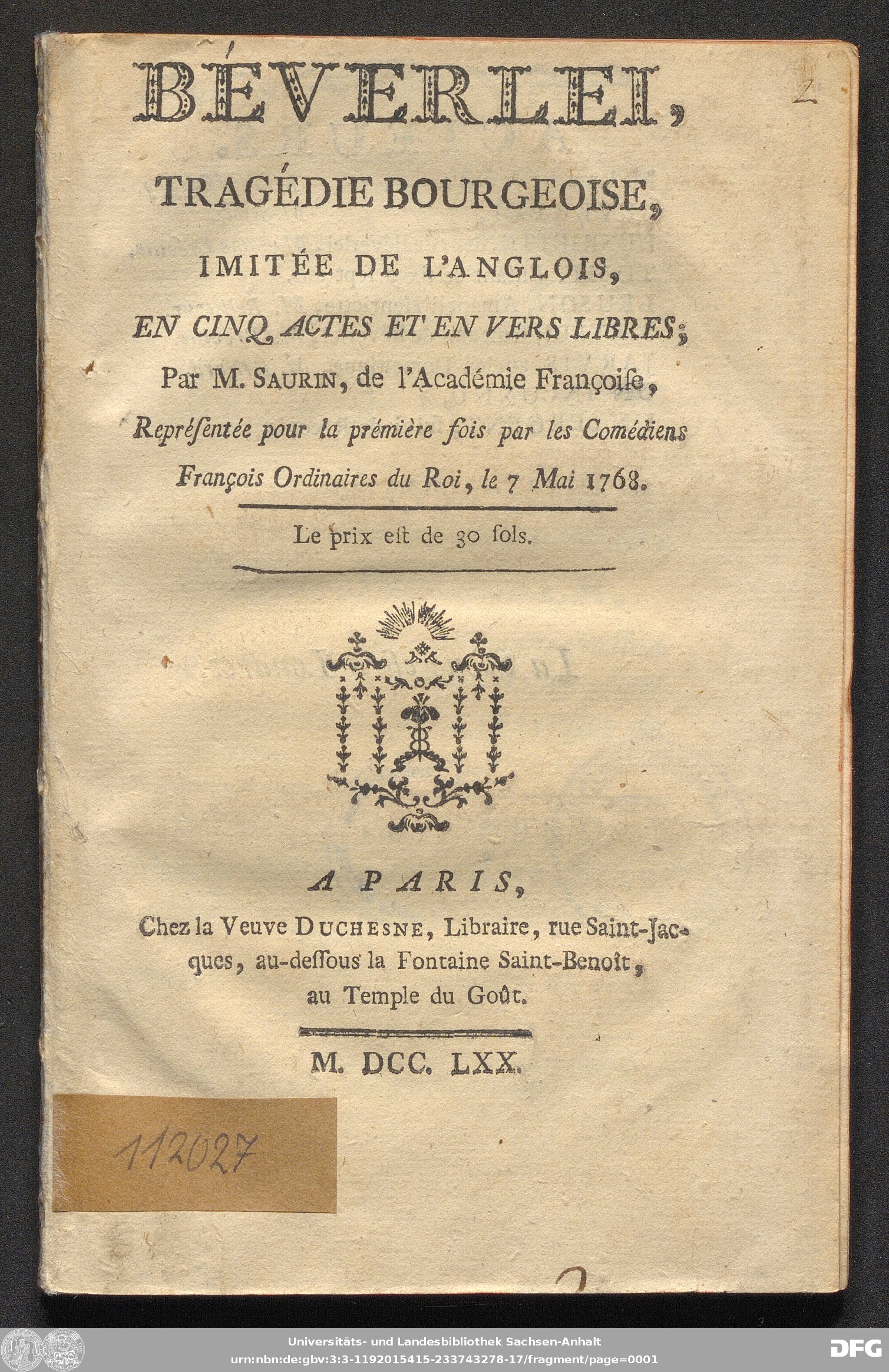 | Erschienen: | Paris : Chez la Veuve Duchesne ; Paris, 1770 |