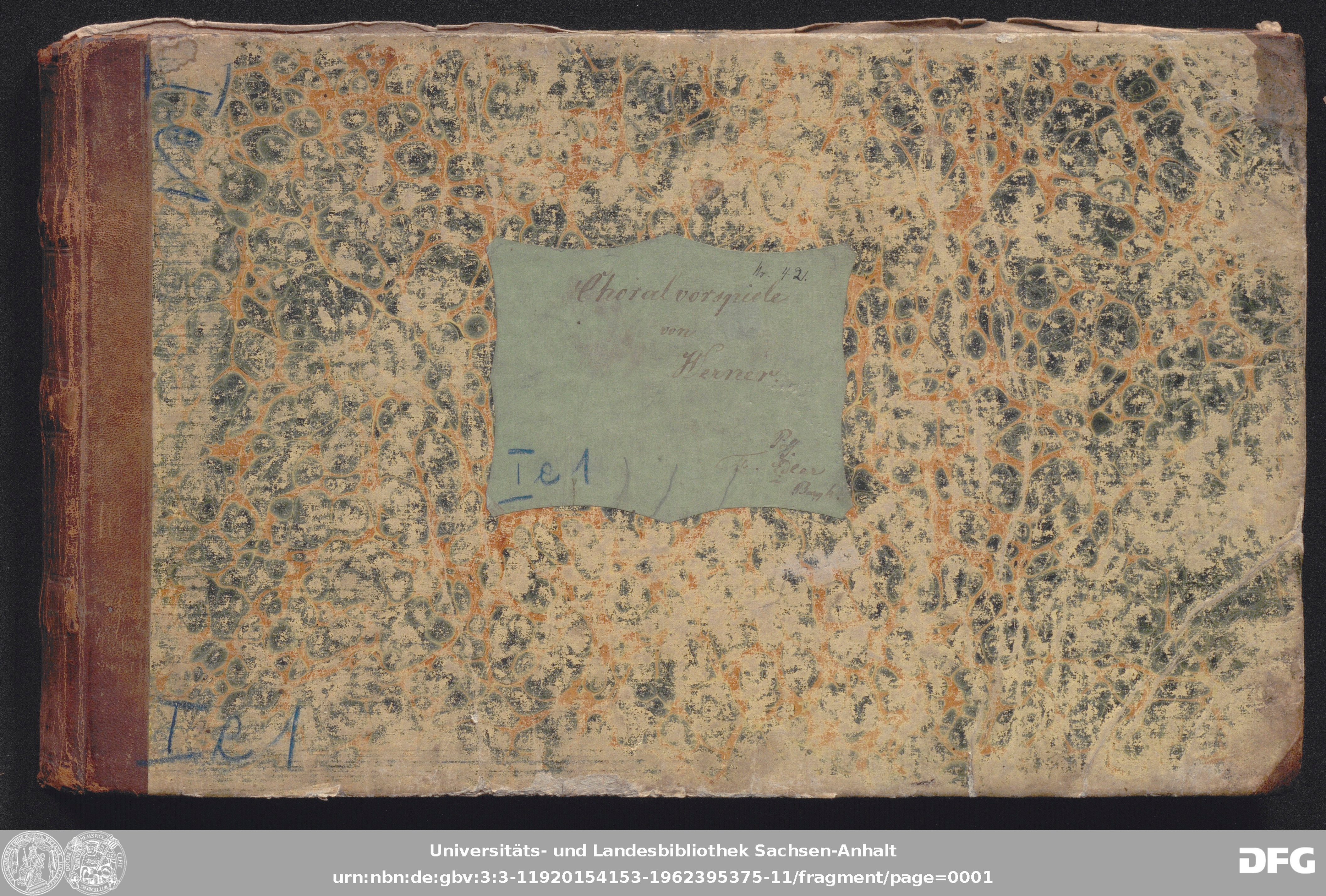 | Annotations: | Angaben zu Schreiber und Provenienz nach dem Katalog der Sammlung Werner (ULB Halle, teilw. handschriftl.) Handschrift DE-3, GND 2024680-8, Signatur: Werner I e 1 Halbledereinband: braunes Leder / Marmorpapier Vorbesitz: Sammlung Arno Werner, Bitterfeld Vermutlich unvollständige Teilabschrift von: "Choral=Buch zu den neuen sächsischen Gesangbüchern", Leipzig: Hofmeister, 1815 Beschreibstoff: Papier Schreiber: Friedrich Wilhelm Ferdinand Edler, ab 1849 Kantor in Burgkemnitz bei Bitterfeld, ab 1863 in Sotterhausen bei Sangerhausen. Alte Signaturen: No. 42. Musikhandschrift Handschrift |