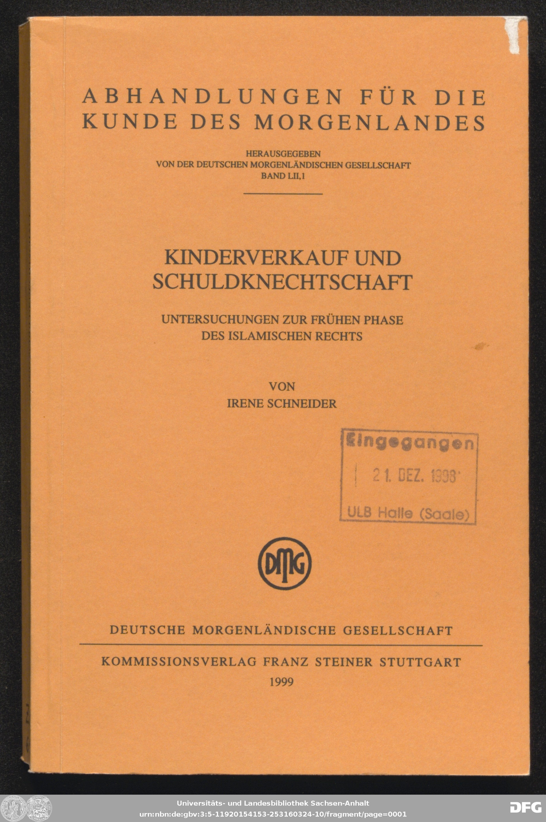 http://dx.doi.org/10.25673/121629| Title: | Kinderverkauf und Schuldknechtschaft : Untersuchungen zur frühen Phase des islamischen Rechts / von Irene Schneider. Deutsche Morgenländische Gesellschaft |