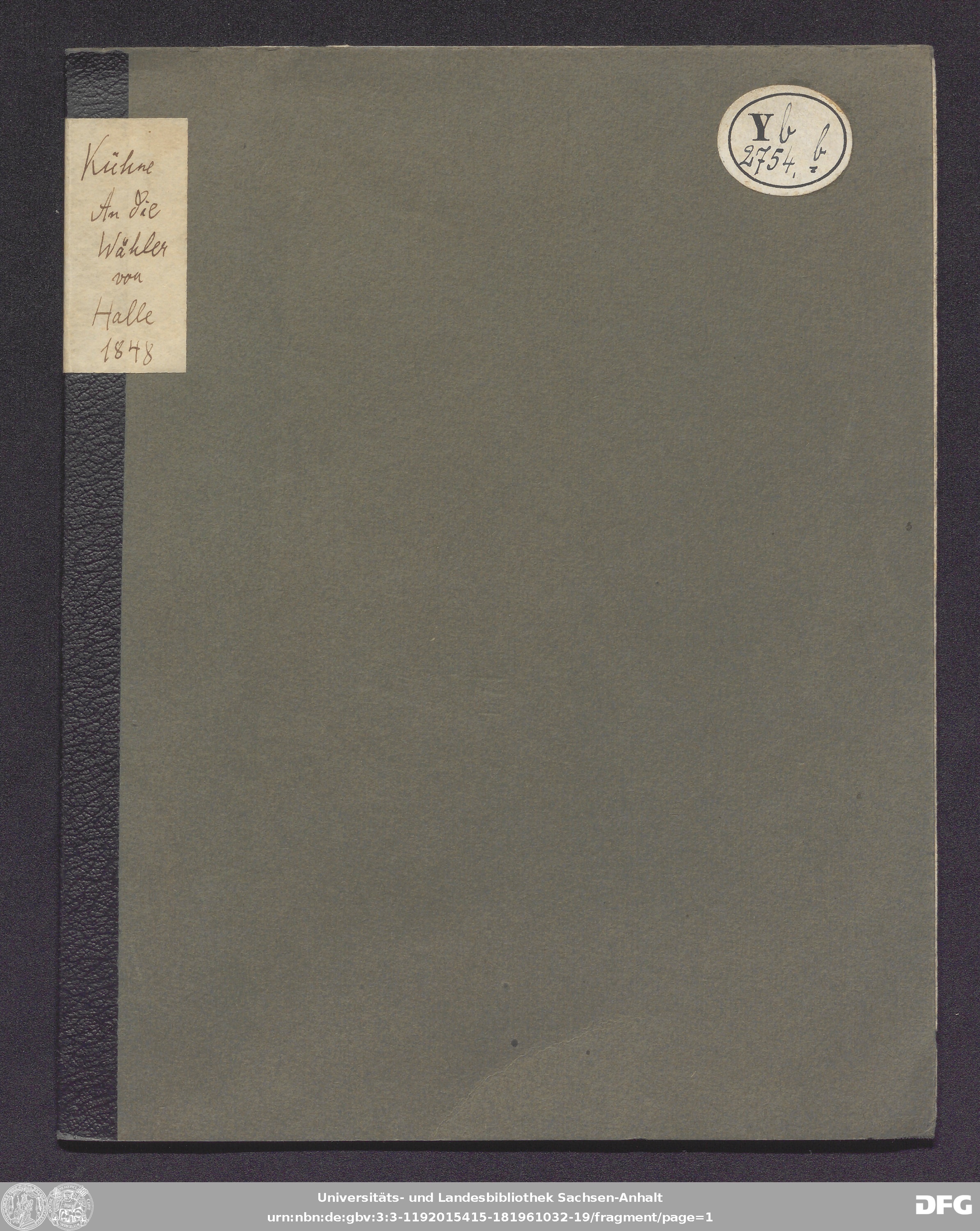 http://dx.doi.org/10.25673/101273| Title: | An die hochverehrten Wähler der Stadt Halle / Karl Heinrich Kühne, Geheimer Ober-Finanz- und vortragender Rath in der zweiten Abtheilung des Königl. Finanz-Ministeriums |