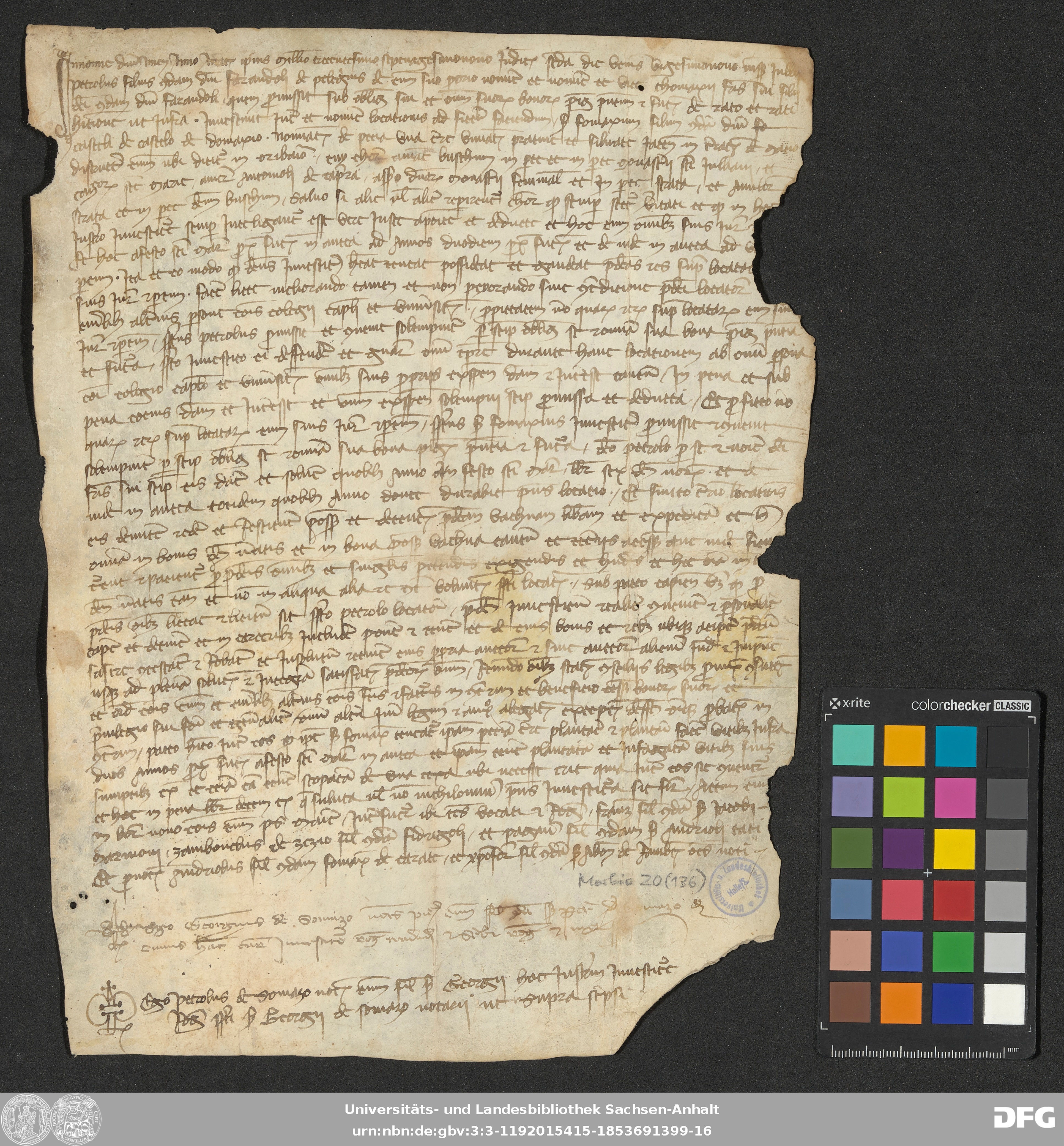 | Annotations: | Handschrift DE-3, GND 2024680-8, Signatur: Morbio 20 (136) Die Illustrationen sind: Initiale, Notarszeichen Überlieferungsart: original Beschreibstoff: Pergament Erhaltungszustand: moderat Handschrift Urkunde |