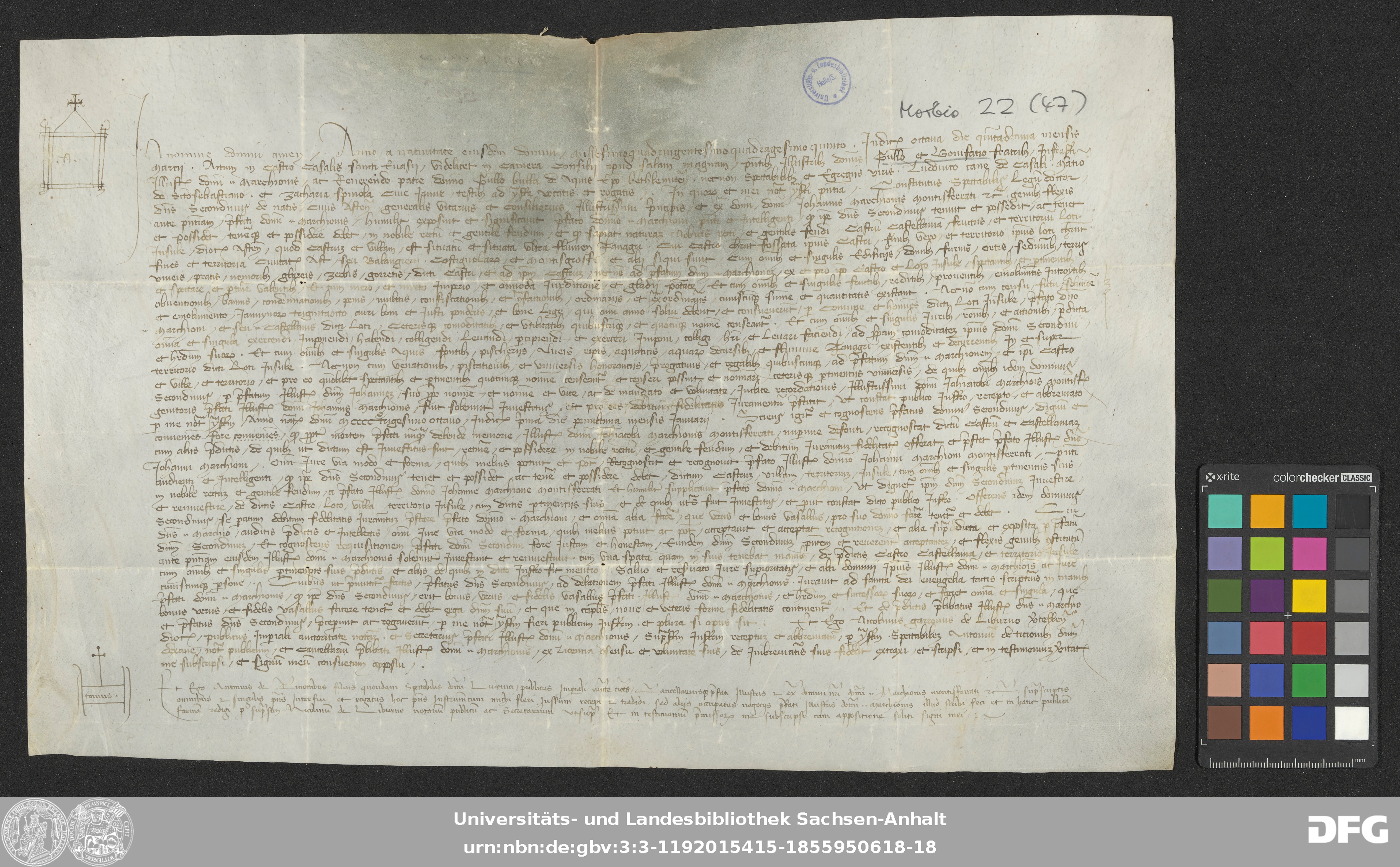 | Annotations: | Handschrift DE-3, GND 2024680-8, Signatur: Morbio 22 (47) Die Illustrationen sind: Notarszeichen mit Namensmonogramm Überlieferungsart: original Beschreibstoff: Pergament Erhaltungszustand: gut Handschrift Urkunde |