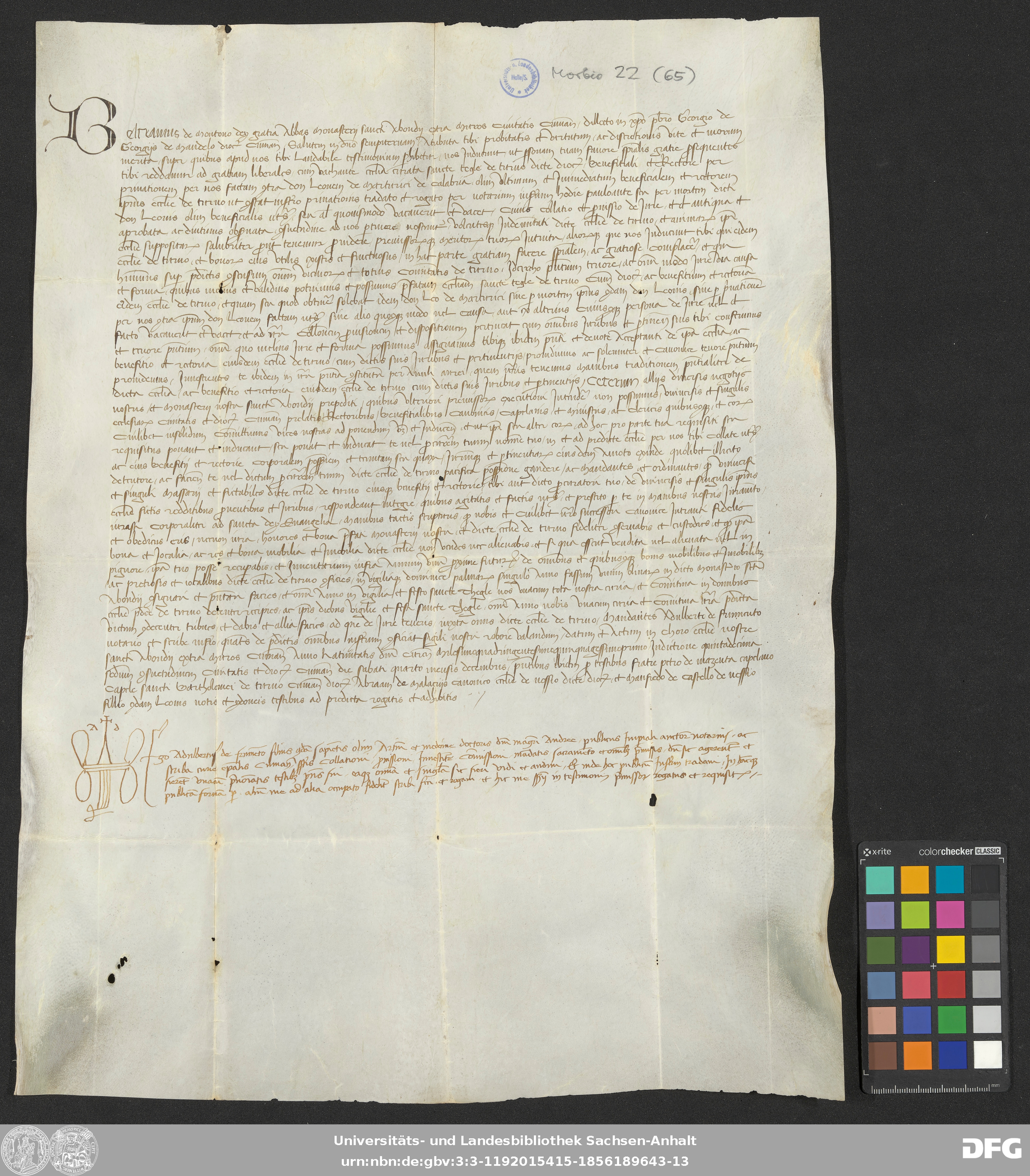 | Annotations: | Handschrift DE-3, GND 2024680-8, Signatur: Morbio 22 (65) Die Illustrationen sind: Initiale, Notarszeichen Überlieferungsart: original Beschreibstoff: Pergament Erhaltungszustand: gut Handschrift Urkunde |