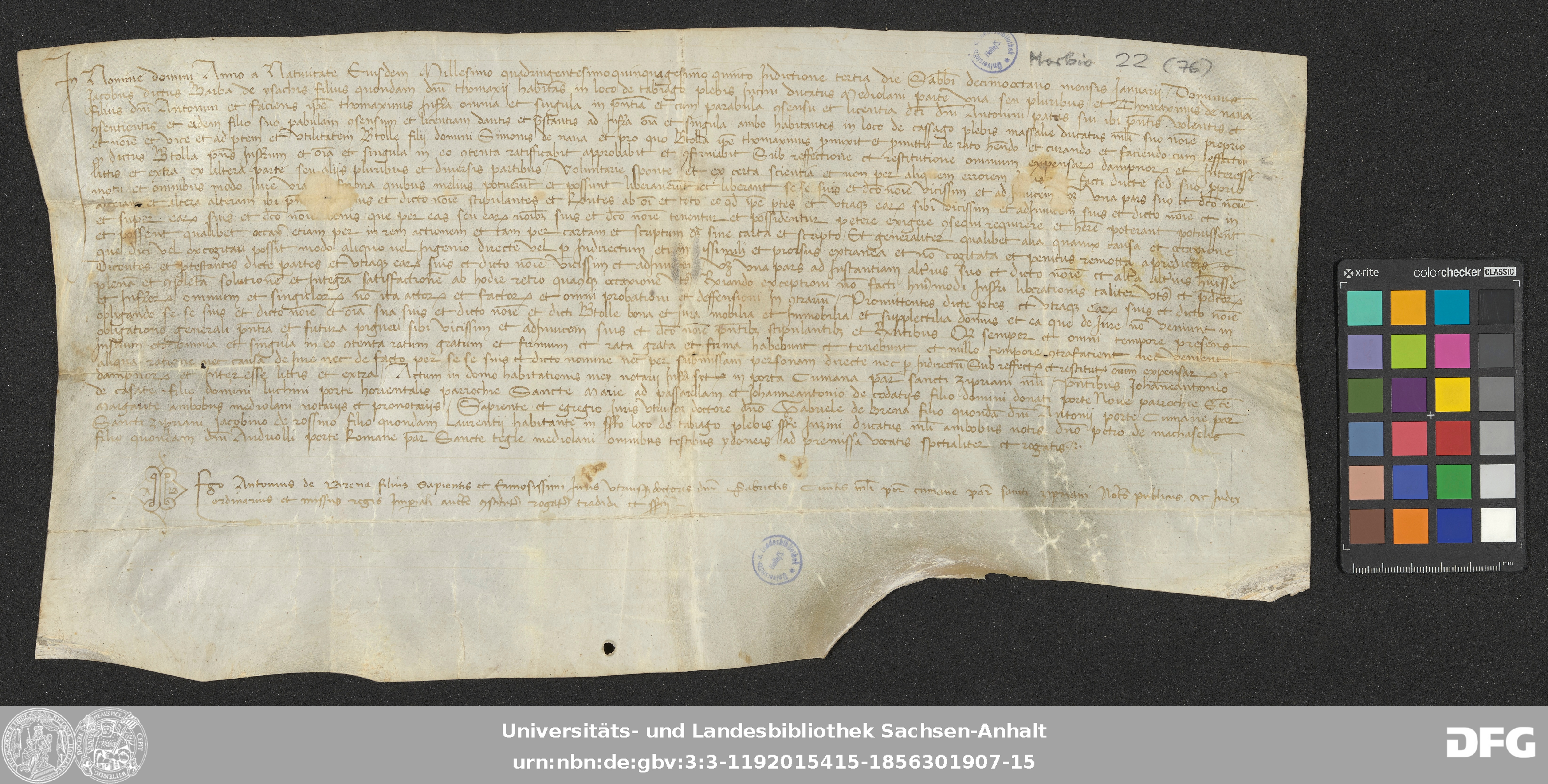 | Annotations: | Handschrift DE-3, GND 2024680-8, Signatur: Morbio 22 (76) Die Illustration ist: Notarszeichen Überlieferungsart: original Beschreibstoff: Pergament Erhaltungszustand: moderat Handschrift Urkunde |