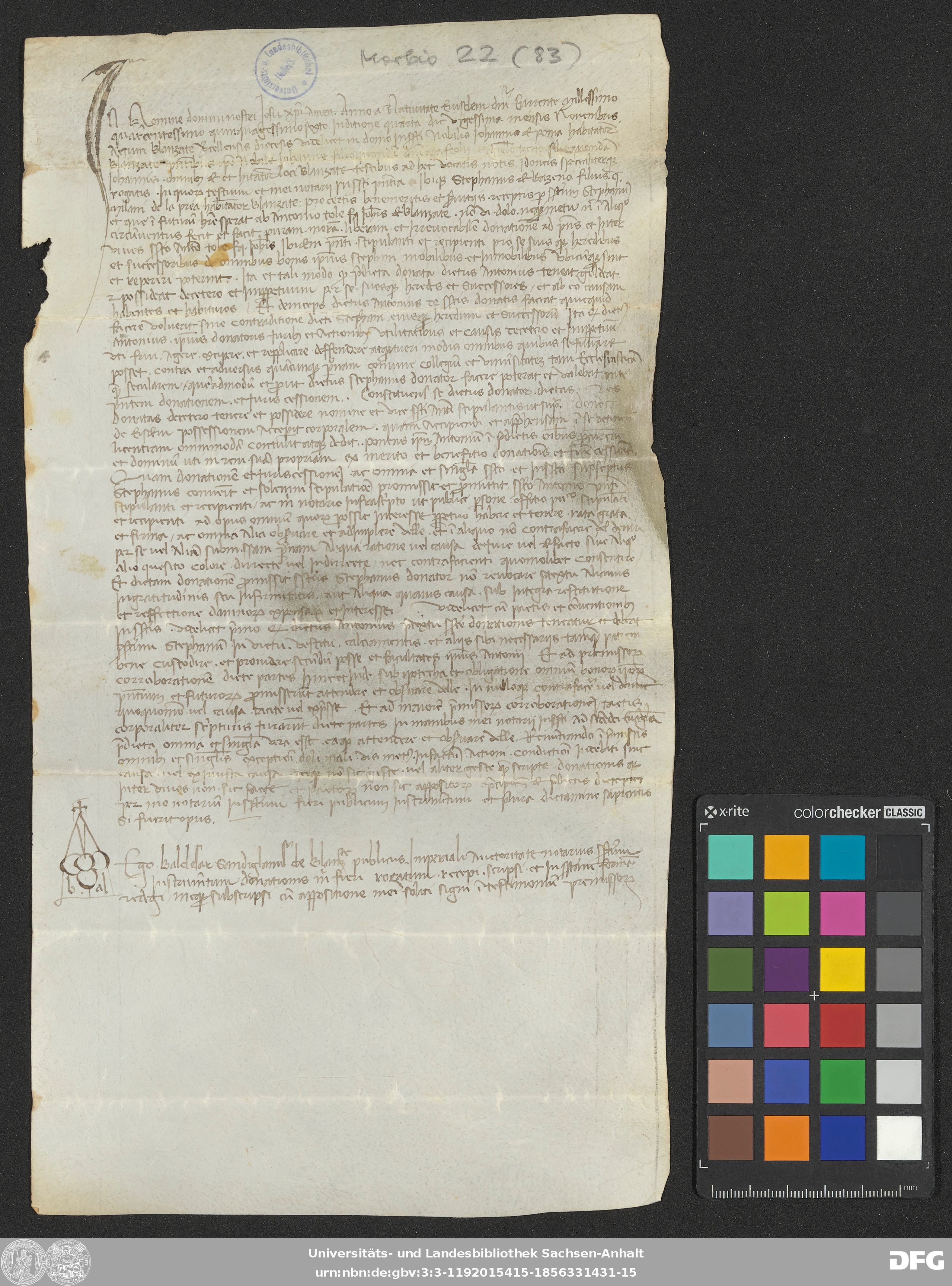 | Annotations: | Handschrift DE-3, GND 2024680-8, Signatur: Morbio 22 (83) Die Illustrationen sind: Initiale, Notarszeichen mit Namensbestandteilen Überlieferungsart: original Beschreibstoff: Pergament Erhaltungszustand: gut Handschrift Urkunde |