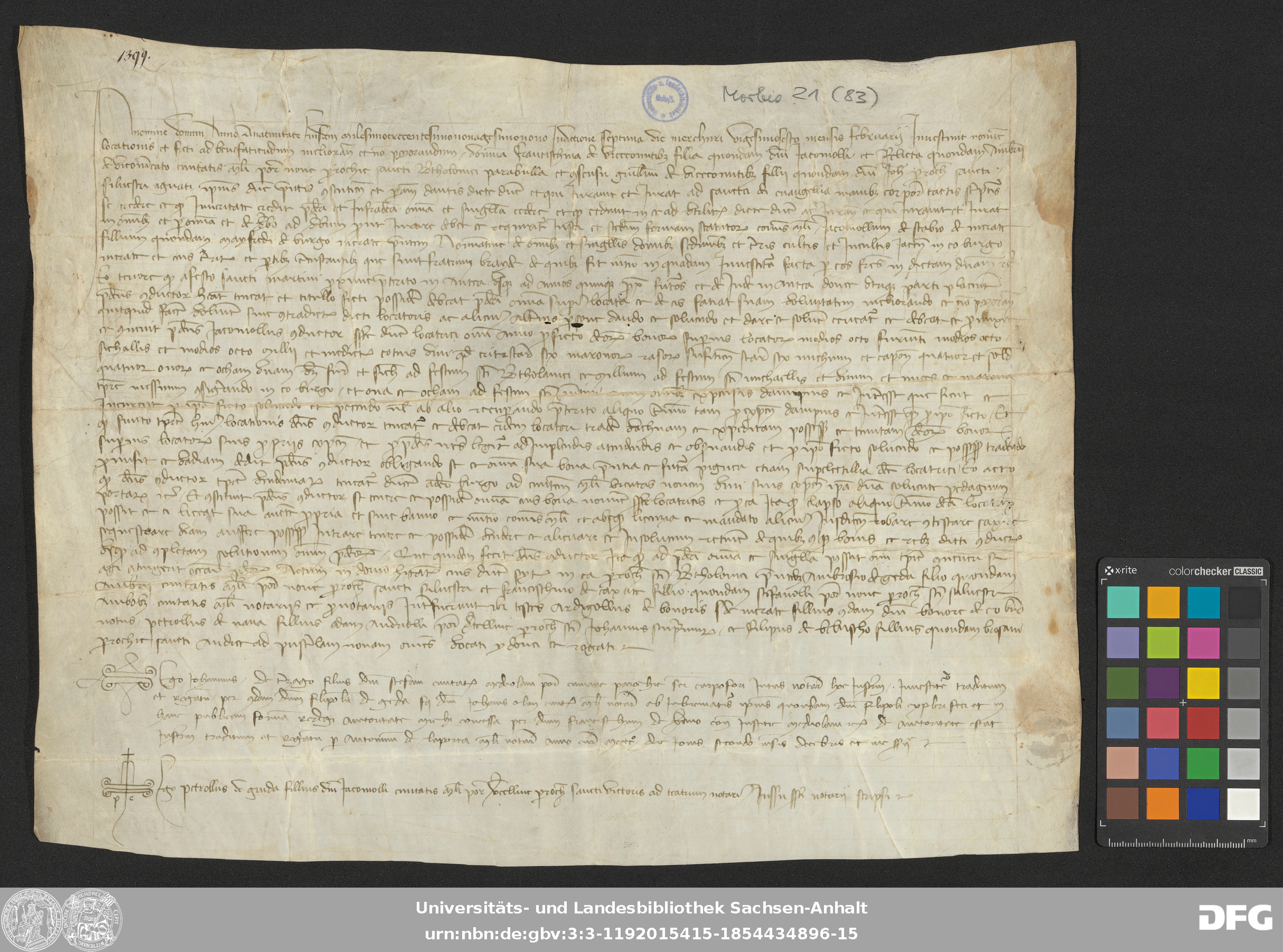 | Annotations: | Handschrift DE-3, GND 2024680-8, Signatur: Morbio 21 (83) Die Illustration ist: Notarszeichen Überlieferungsart: original Beschreibstoff: Pergament Erhaltungszustand: gut Handschrift Urkunde |