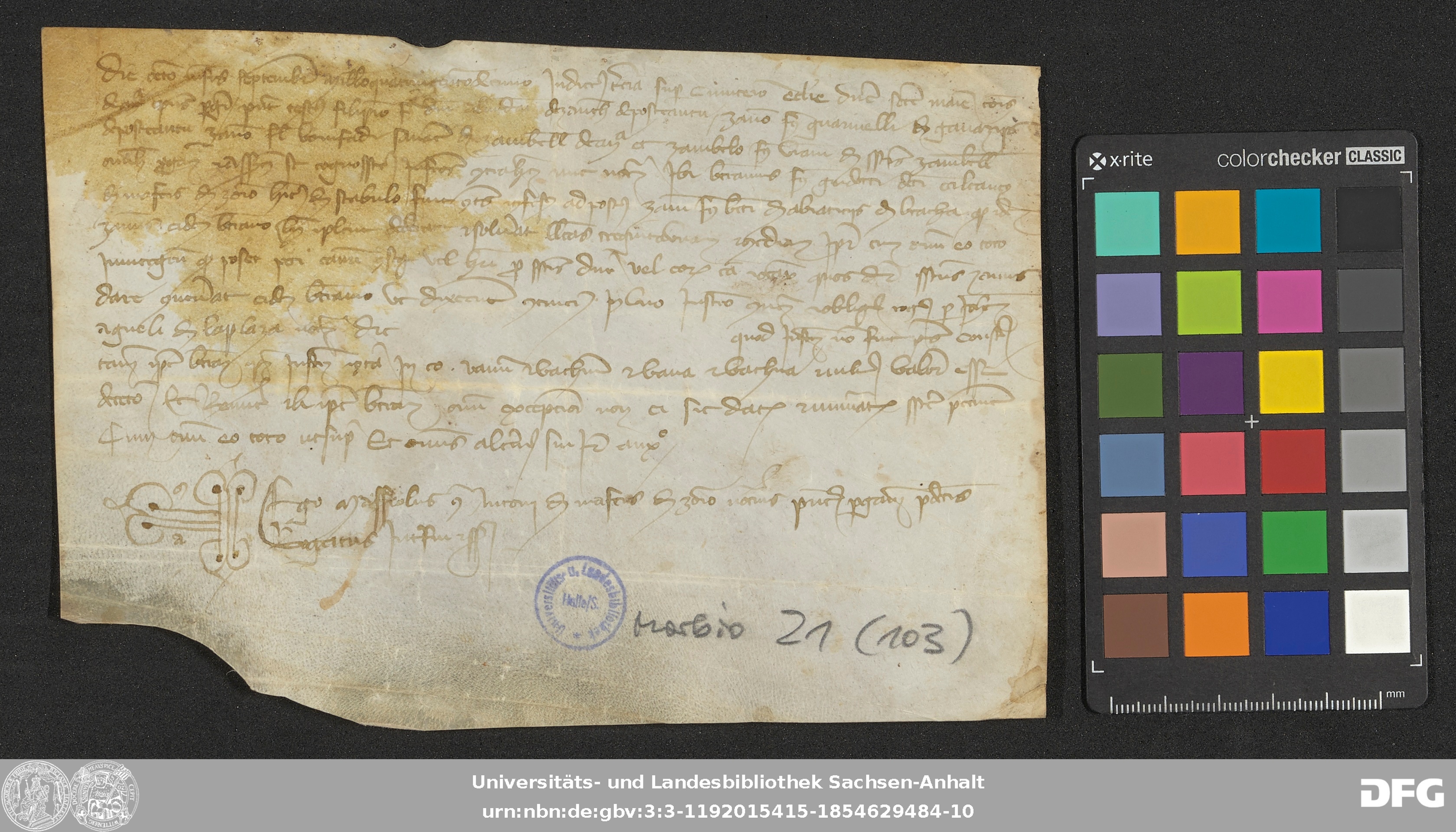 | Annotations: | Handschrift DE-3, GND 2024680-8, Signatur: Morbio 21 (103) Die Illustration ist: Notarszeichen Überlieferungsart: original Beschreibstoff: Pergament Erhaltungszustand: moderat Handschrift Urkunde |