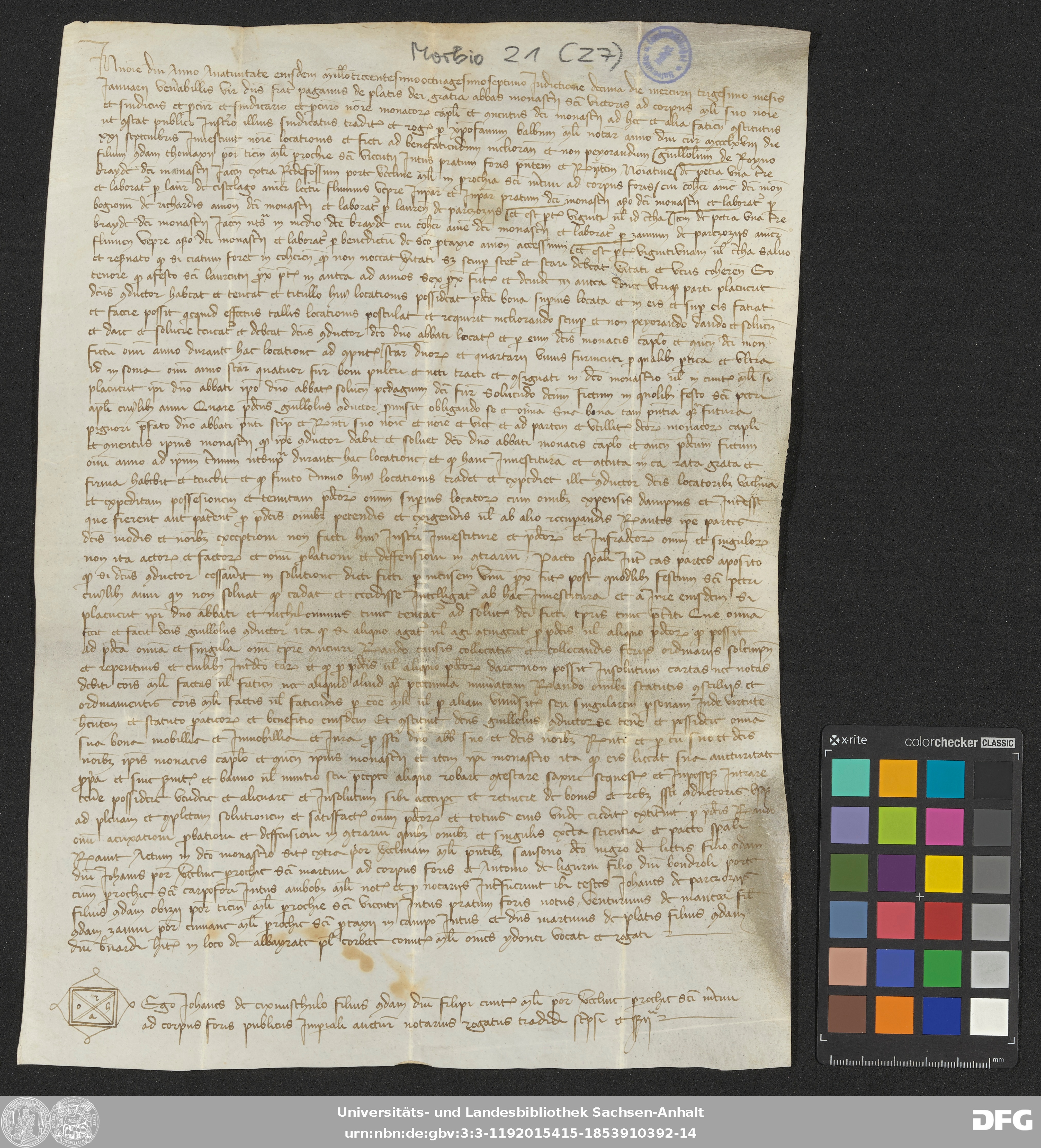| Annotations: | Handschrift DE-3, GND 2024680-8, Signatur: Morbio 21 (27) Die Illustration ist: Notarszeichen Überlieferungsart: original Beschreibstoff: Pergament Erhaltungszustand: gut Handschrift Urkunde |