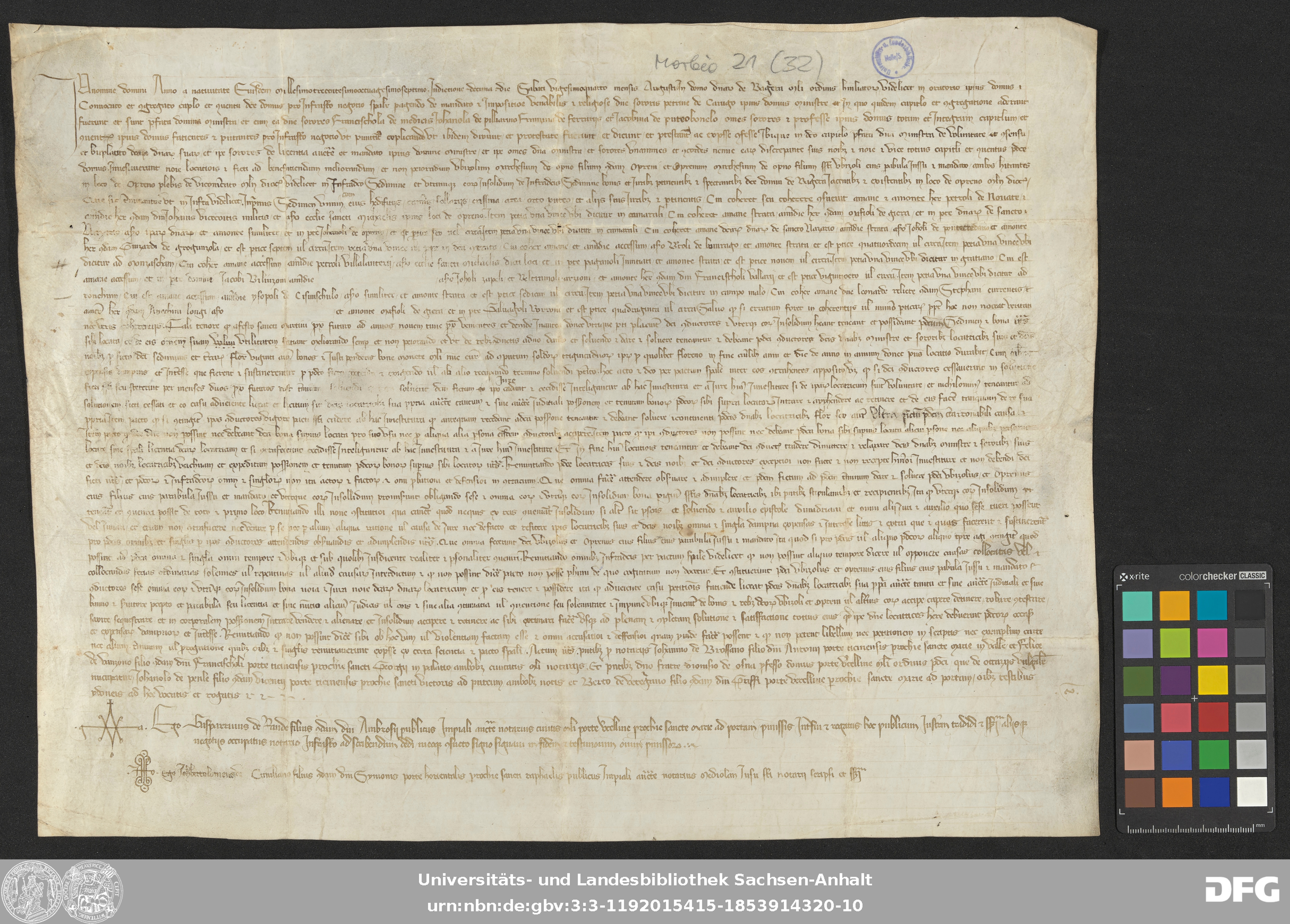 | Annotations: | Handschrift DE-3, GND 2024680-8, Signatur: Morbio 21 (32) Die Illustrationen sind: Initiale, Notarszeichen Überlieferungsart: original Beschreibstoff: Pergament Erhaltungszustand: gut Handschrift Urkunde |