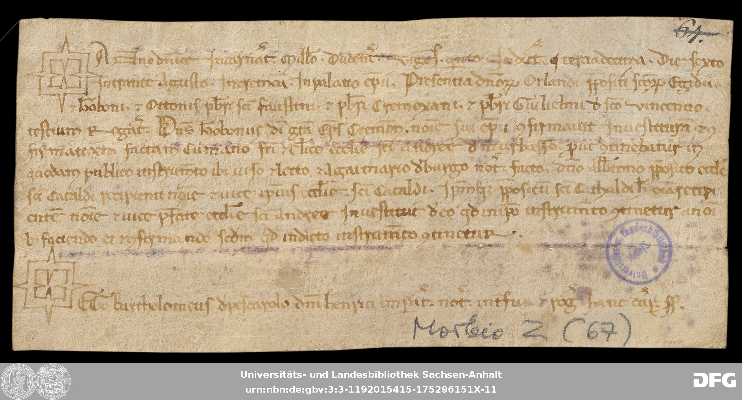 | Series: | Urkunden aus der Sammlung Morbio der Universitäts- und Landesbibliothek Sachsen-Anhalt Halle |