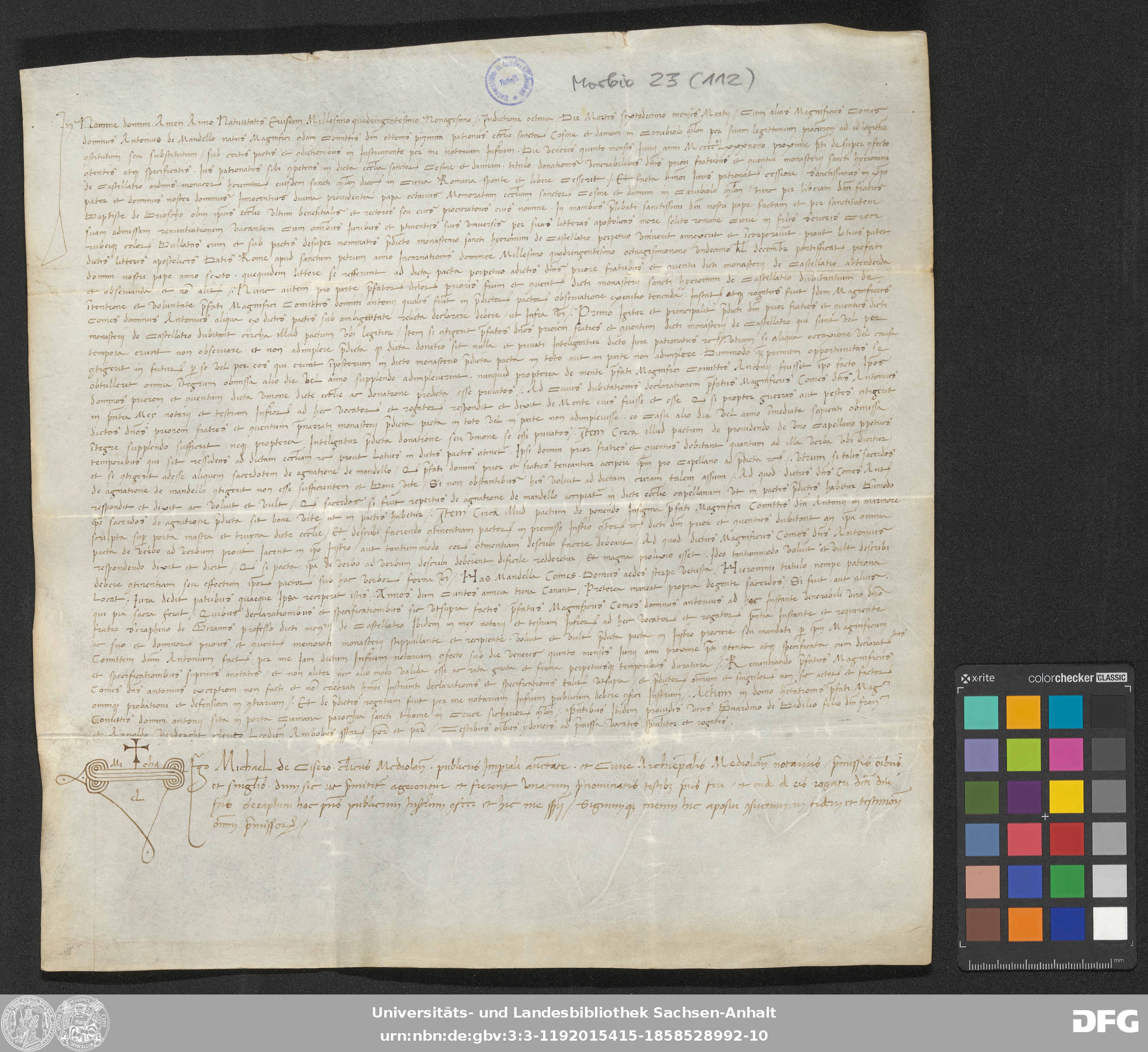 | Annotations: | Handschrift DE-3, GND 2024680-8, Signatur: Morbio 23 (112) Die Illustration ist: Notarszeichen Beschreibstoff: Pergament Erhaltungszustand: gut Handschrift Urkunde |