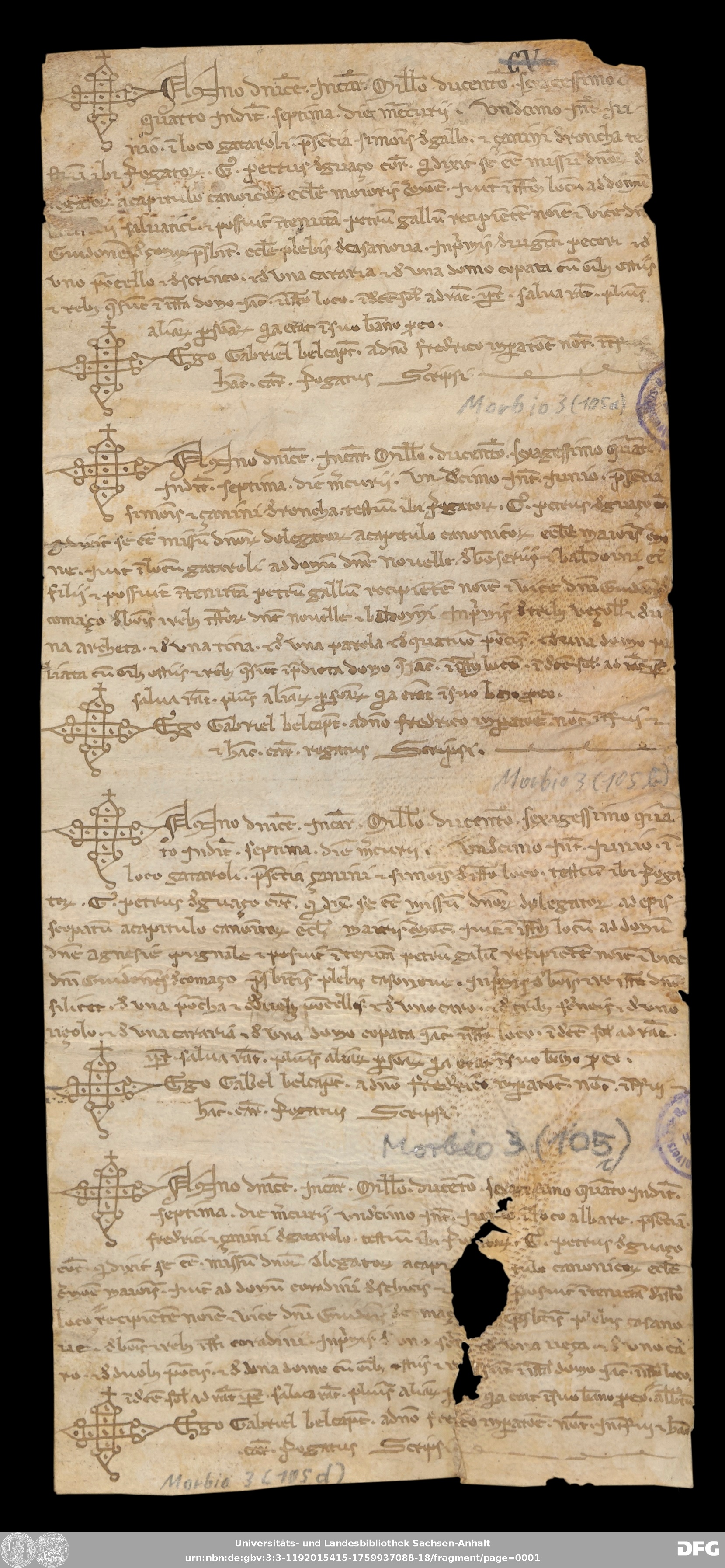 | Annotations: | Handschrift DE-3, GND 2024680-8, Signatur: Morbio 3 (105 c) Die Illustrationen sind: Notarszeichen Überlieferungsart: original Beschreibstoff: Pergament Erhaltungszustand: moderat Handschrift Urkunde |