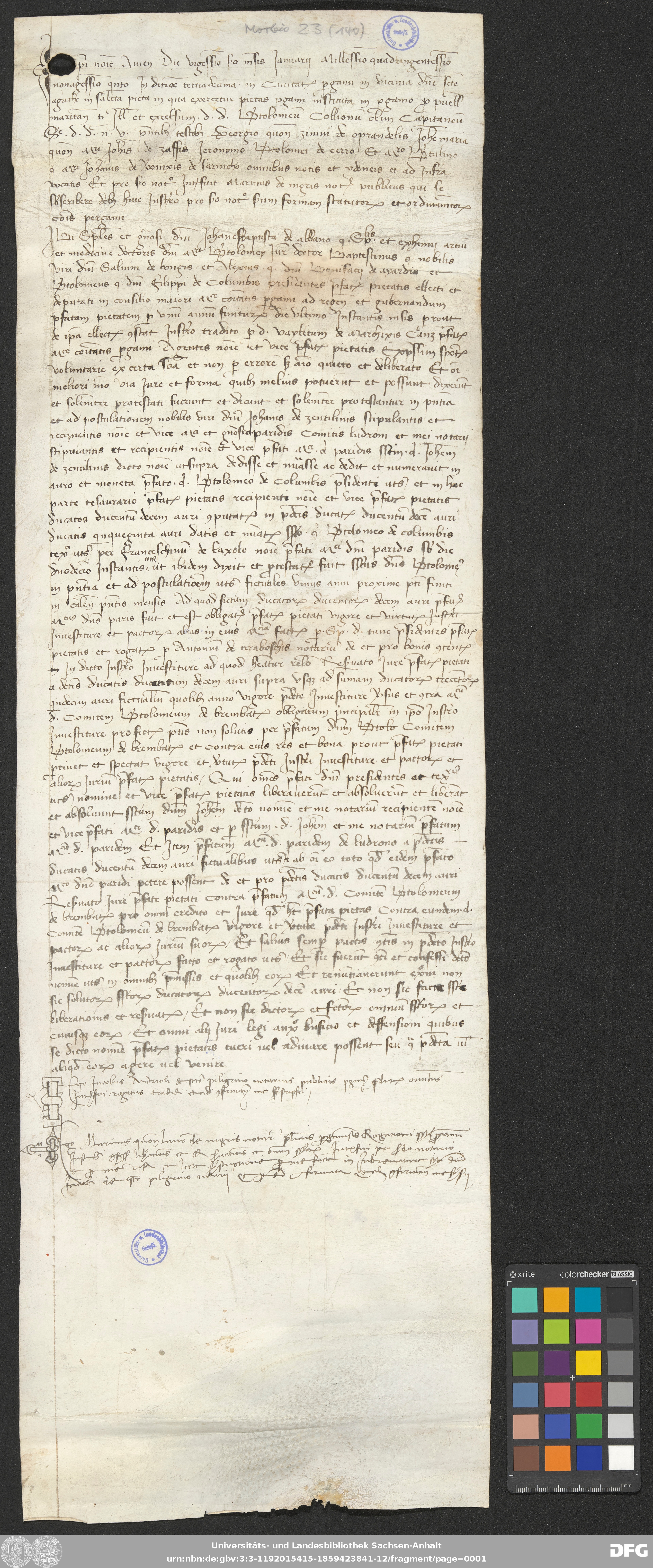 | Annotations: | Handschrift DE-3, GND 2024680-8, Signatur: Morbio 23 (140) Die Illustrationen sind: Initiale, Notarszeichen Beschreibstoff: Pergament Erhaltungszustand: moderat Textverlust durch Pergamentverlust Handschrift Urkunde |