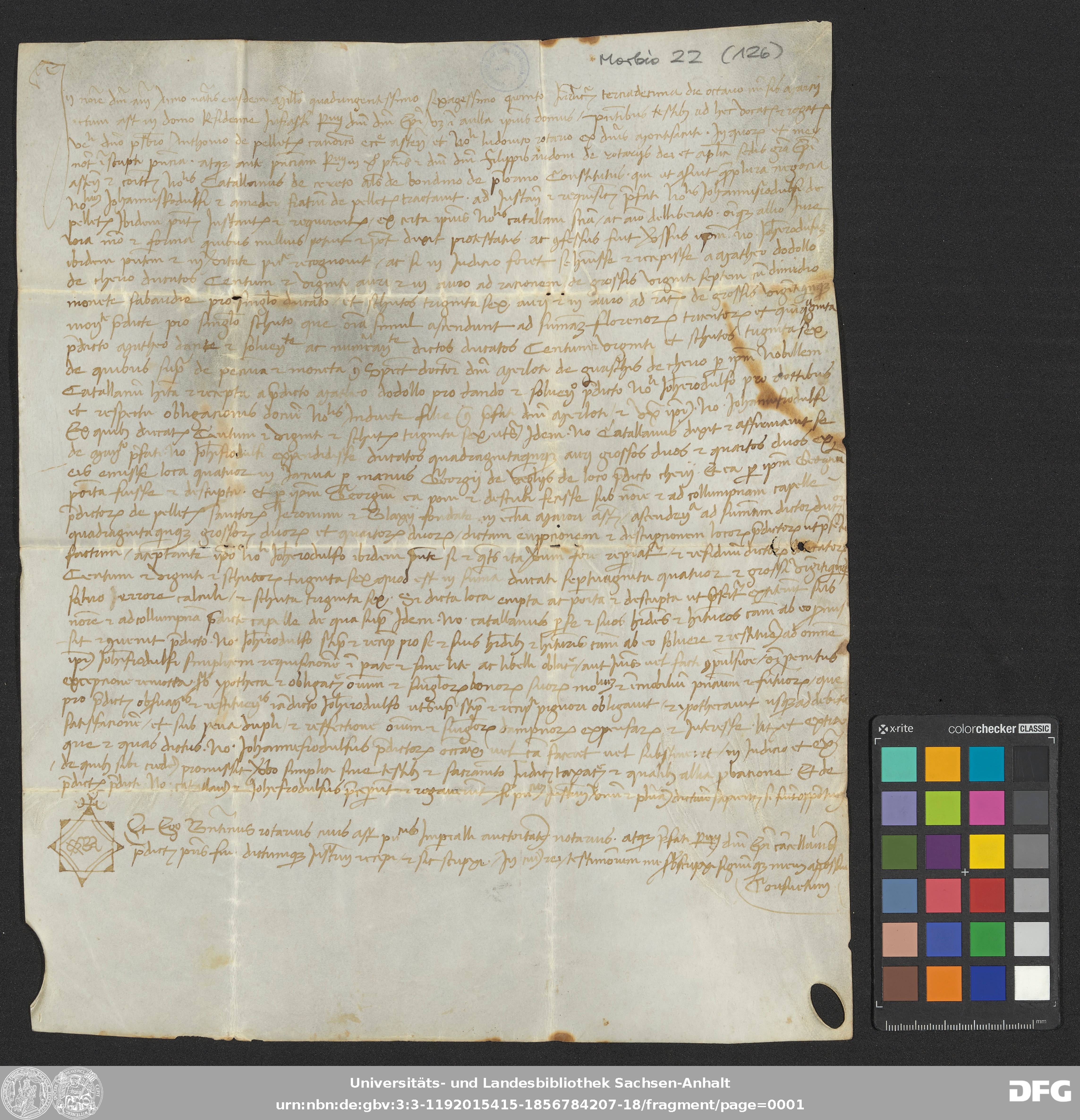 | Annotations: | Handschrift DE-3, GND 2024680-8, Signatur: Morbio 22 (126) Die Illustration ist: Notarszeichen mit Namensbestandteilen Überlieferungsart: original Beschreibstoff: Pergament Erhaltungszustand: moderat Handschrift Urkunde |