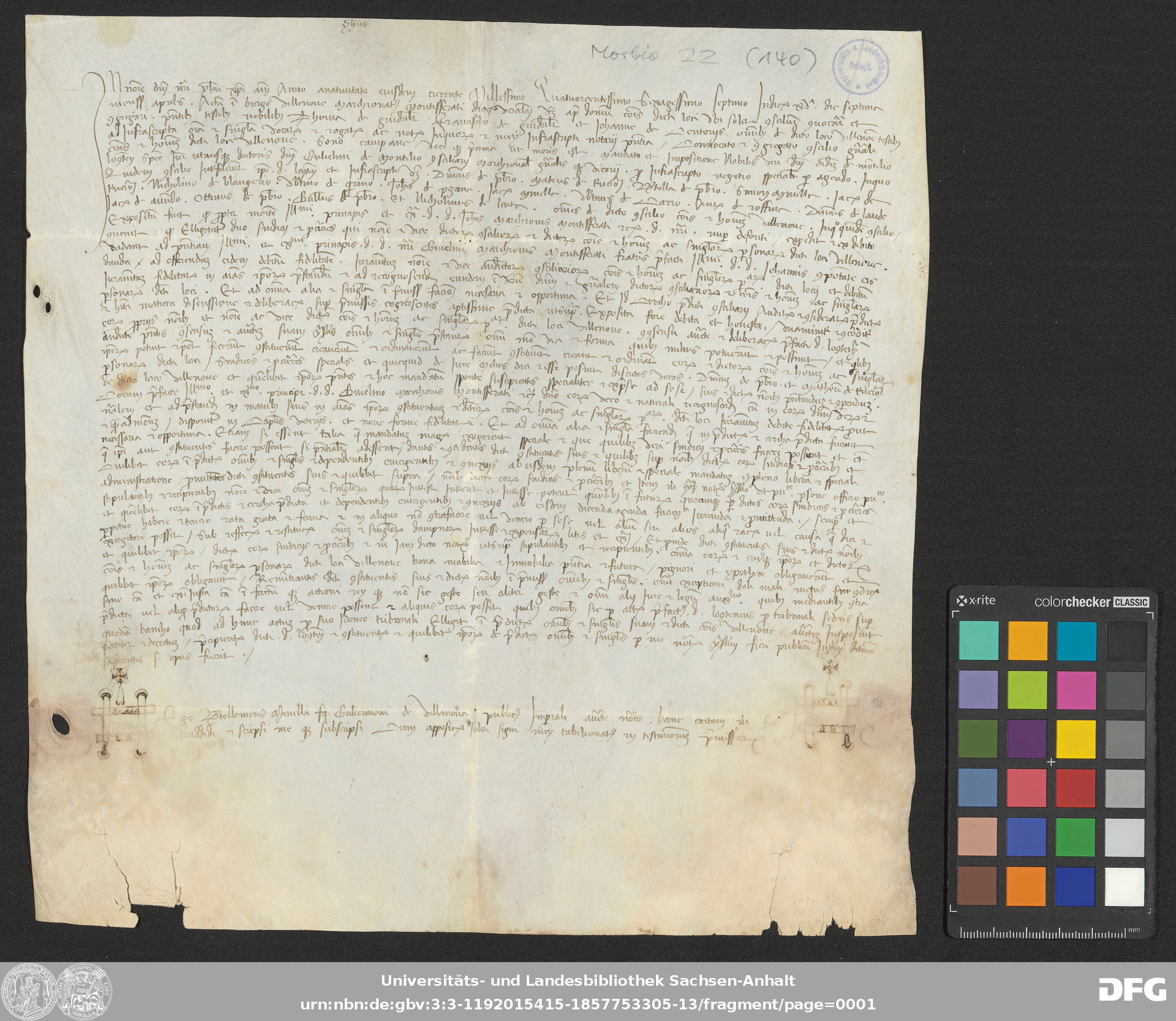 | Annotations: | Handschrift DE-3, GND 2024680-8, Signatur: Morbio 22 (140) Die Illustration ist: Notarszeichen Überlieferungsart: original Beschreibstoff: Pergament Erhaltungszustand: gut Handschrift Urkunde |