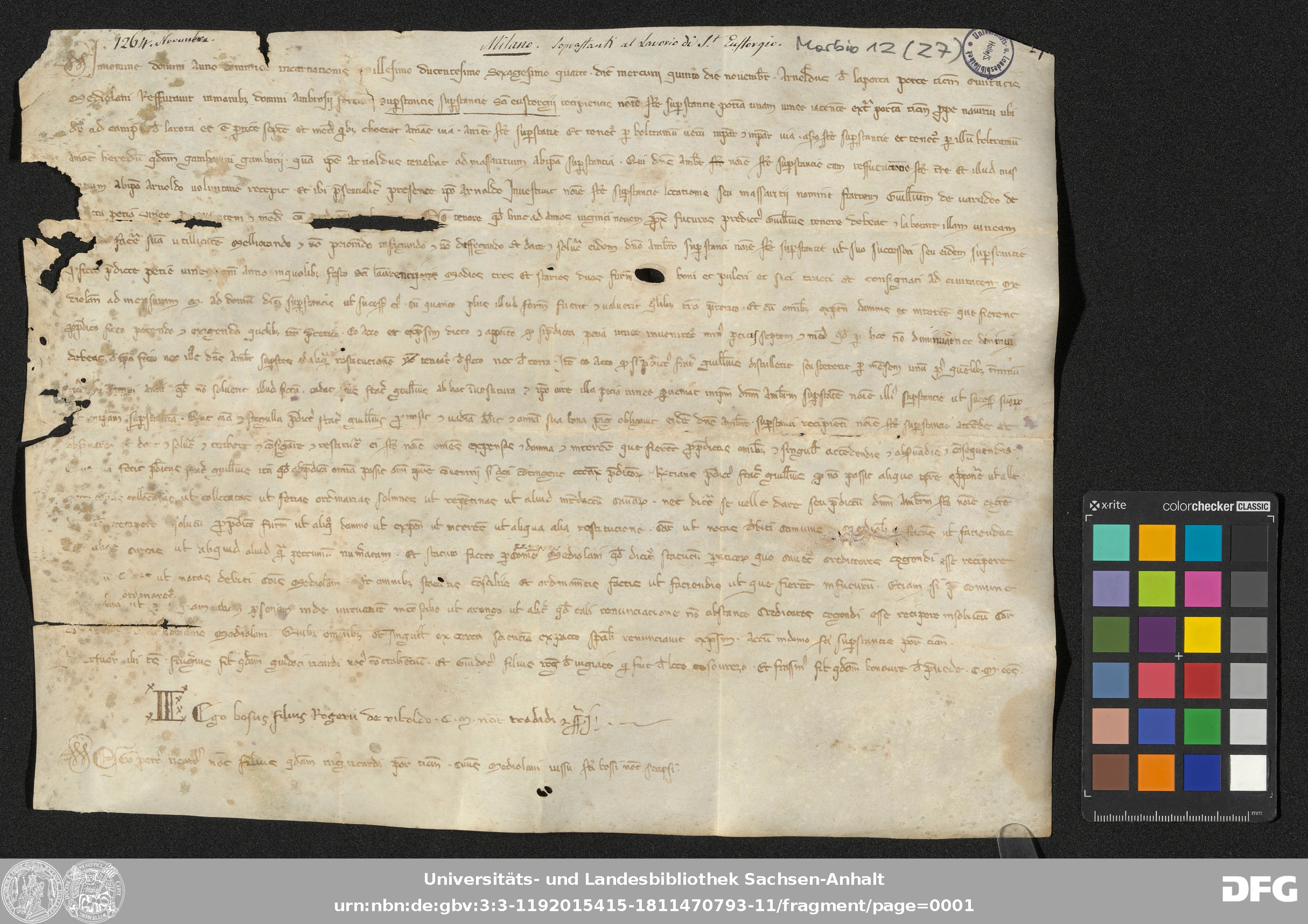| Annotations: | Handschrift DE-3, GND 2024680-8, Signatur: Morbio 12 (27) Die Illustrationen sind: Notarszeichen Überlieferungsart: original Beschreibstoff: Pergament Erhaltungszustand: moderat Handschrift Urkunde |