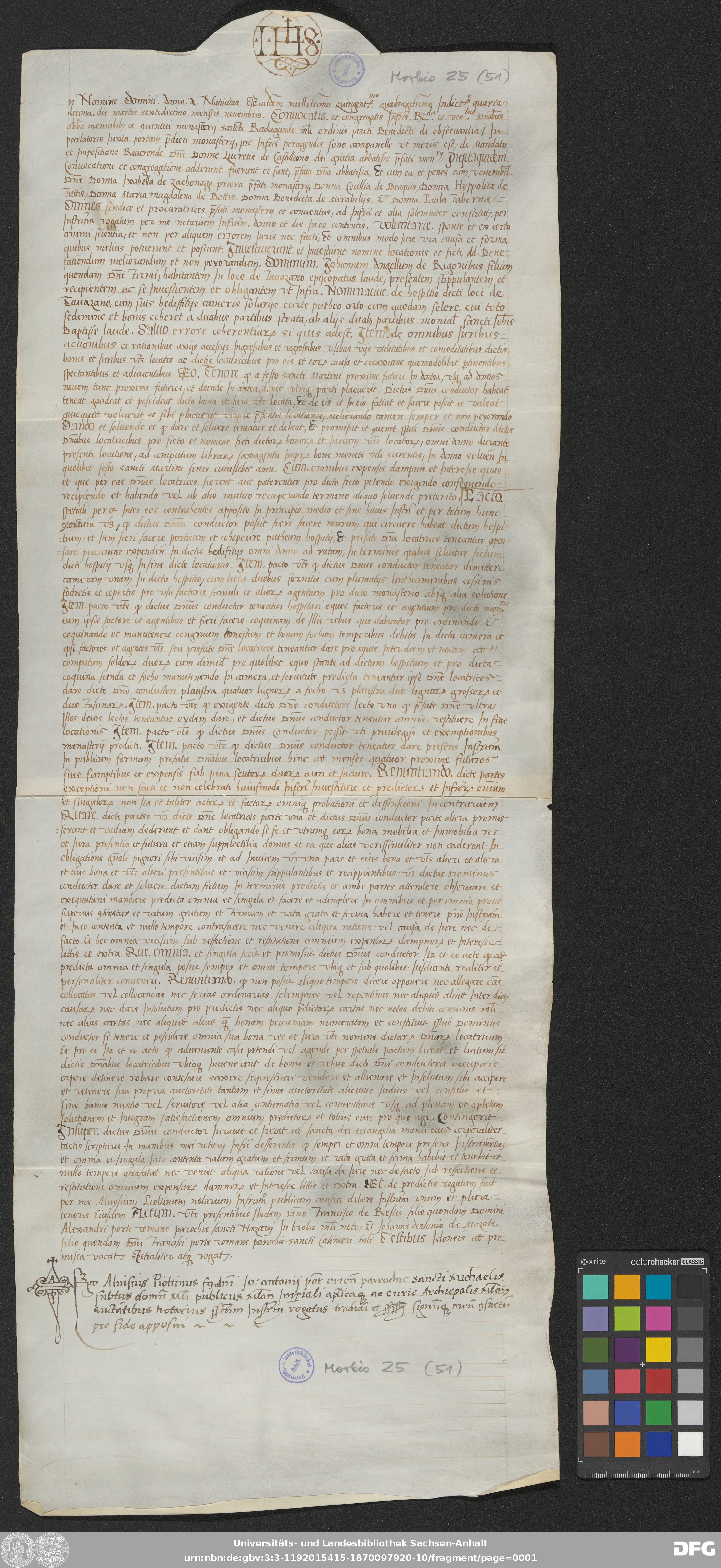 | Annotations: | Handschrift DE-3, GND 2024680-8, Signatur: Morbio 25 (51) Die Illustrationen sind: Nomen sacrum, Notarszeichen Beschreibstoff: Pergament Erhaltungszustand: gut Handschrift Urkunde |