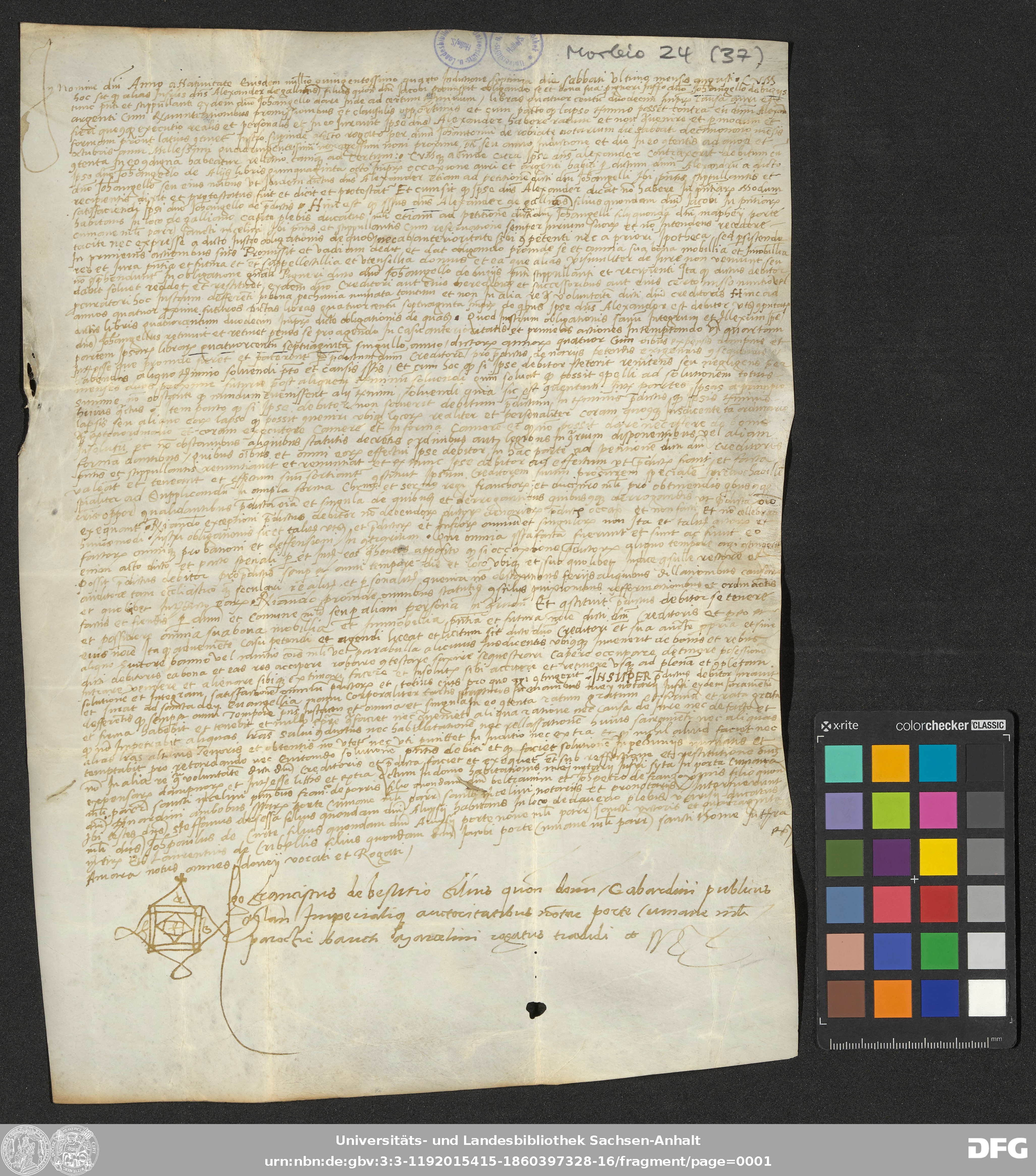 | Annotations: | Handschrift DE-3, GND 2024680-8, Signatur: Morbio 24 (37) Die Illustration ist: Notarszeichen Überlieferungsart: original Beschreibstoff: Pergament Erhaltungszustand: moderat Handschrift Urkunde |