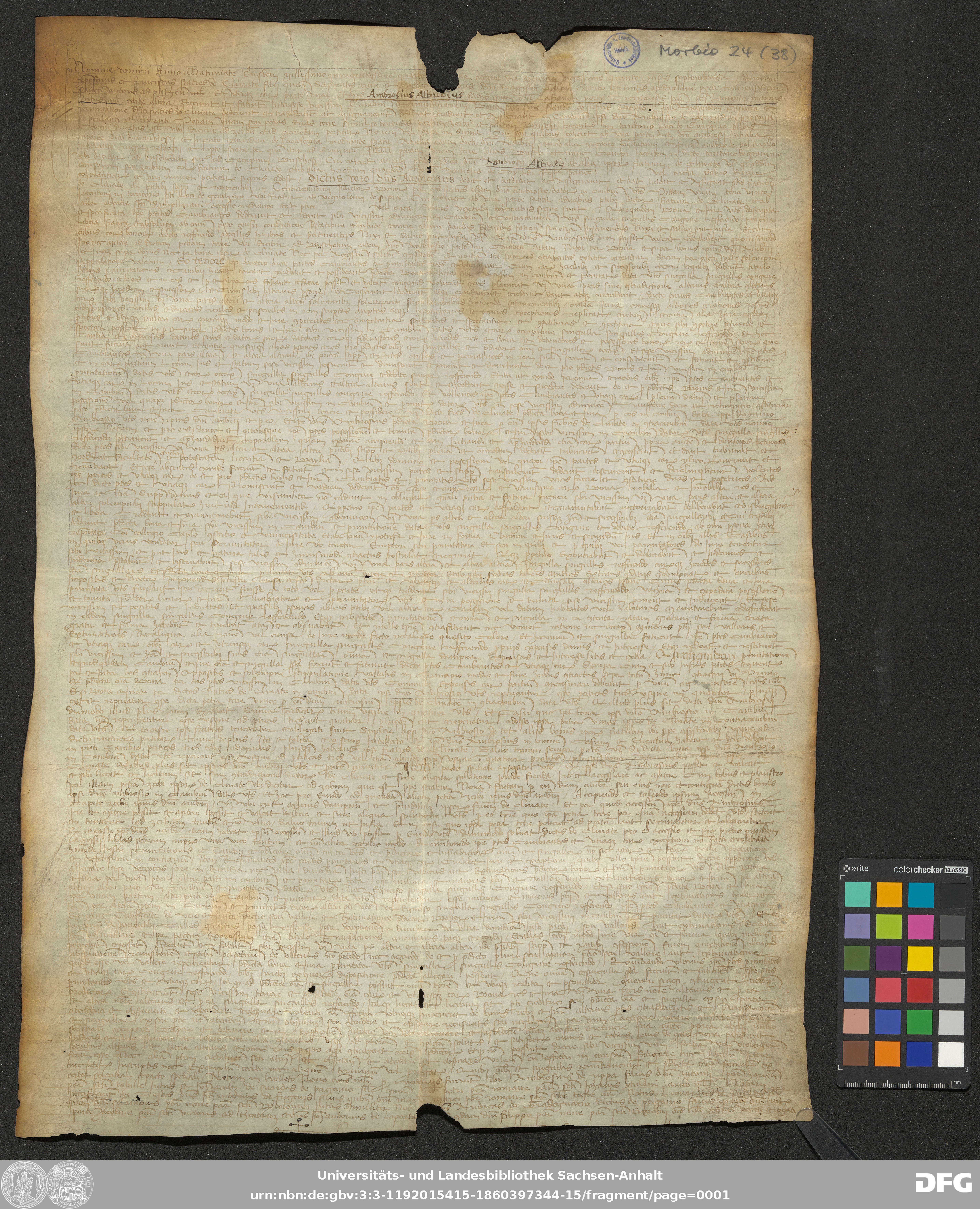 | Annotations: | Handschrift DE-3, GND 2024680-8, Signatur: Morbio 24 (38) Beschreibstoff: Pergament Erhaltungszustand: moderat Notarszeichen abgeschnitten Handschrift Urkunde |
