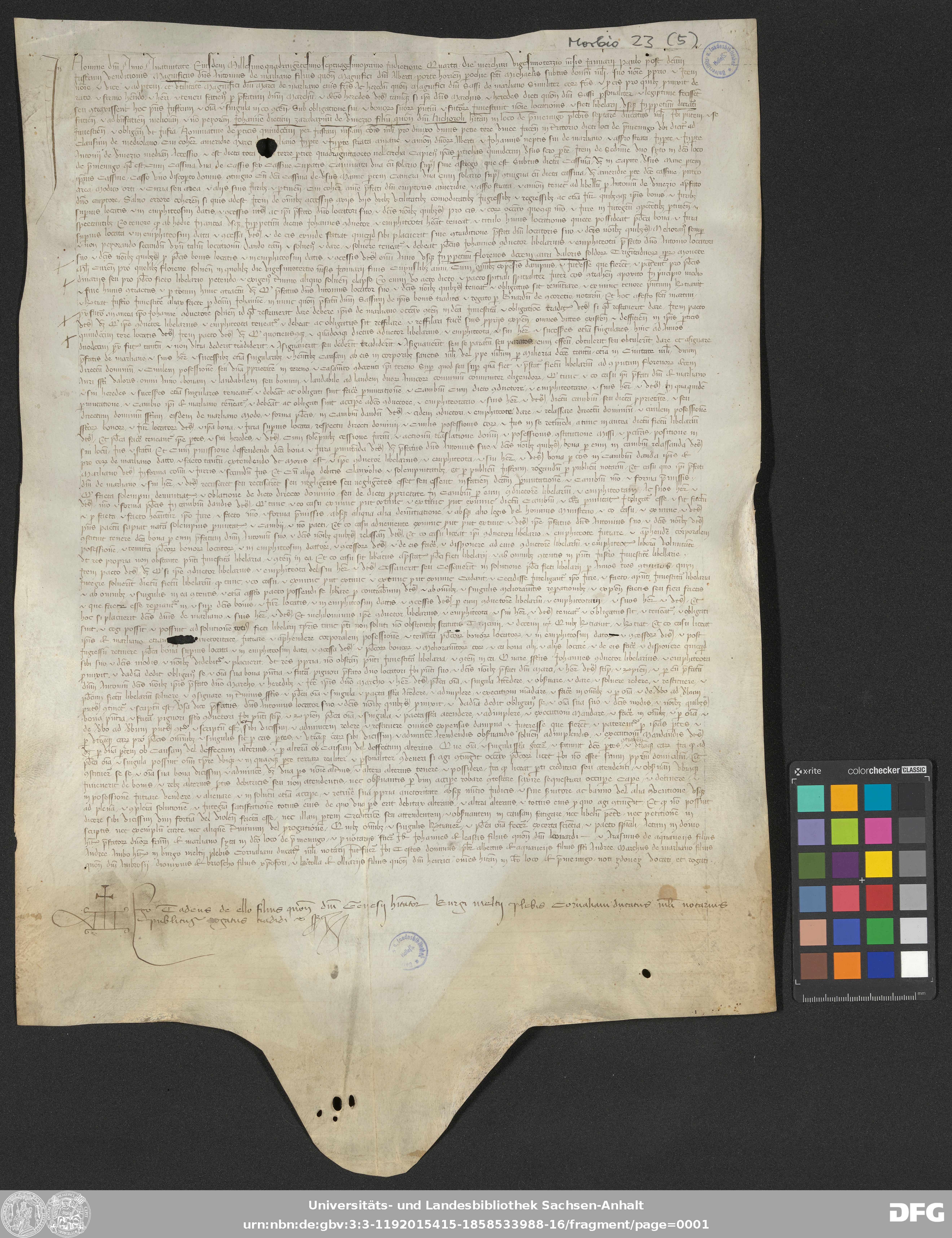 | Annotations: | Handschrift DE-3, GND 2024680-8, Signatur: Morbio 23 (5) Die Illustration ist: Notarszeichen Überlieferungsart: original Beschreibstoff: Pergament Handschrift Urkunde |