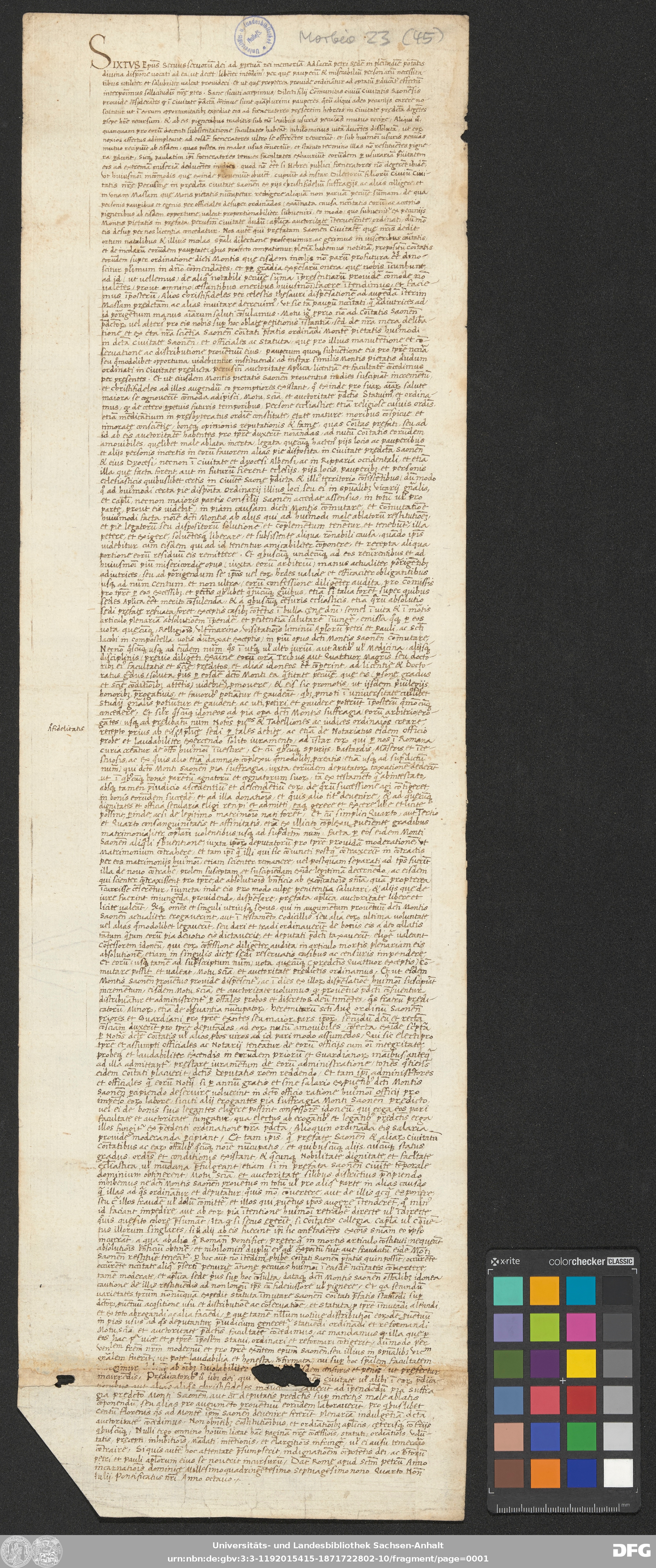 | Annotations: | Handschrift DE-3, GND 2024680-8, Signatur: Morbio 23 (45) Die Illustration ist: erste Zeile teilweise in Auszeichnungsschrift Beschreibstoff: Papier Erhaltungszustand: moderat Beschädigungen und Textverlust durch Löcher im unteren Teil der Urkunde Handschrift Urkunde |