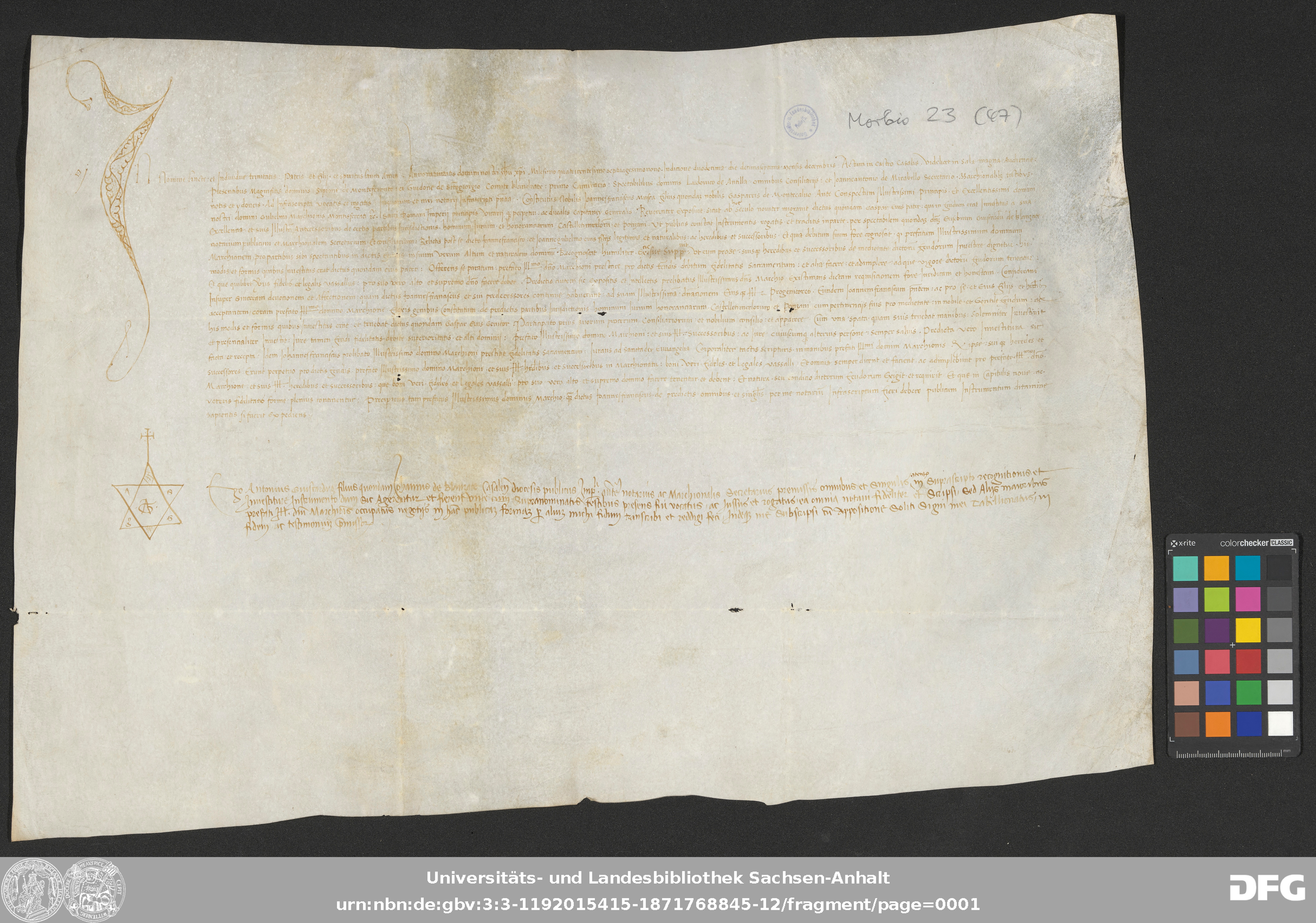 | Annotations: | Handschrift DE-3, GND 2024680-8, Signatur: Morbio 23 (47) Die Illustrationen sind: Initiale, Notarszeichen Beschreibstoff: Pergament Erhaltungszustand: gut Handschrift Urkunde |