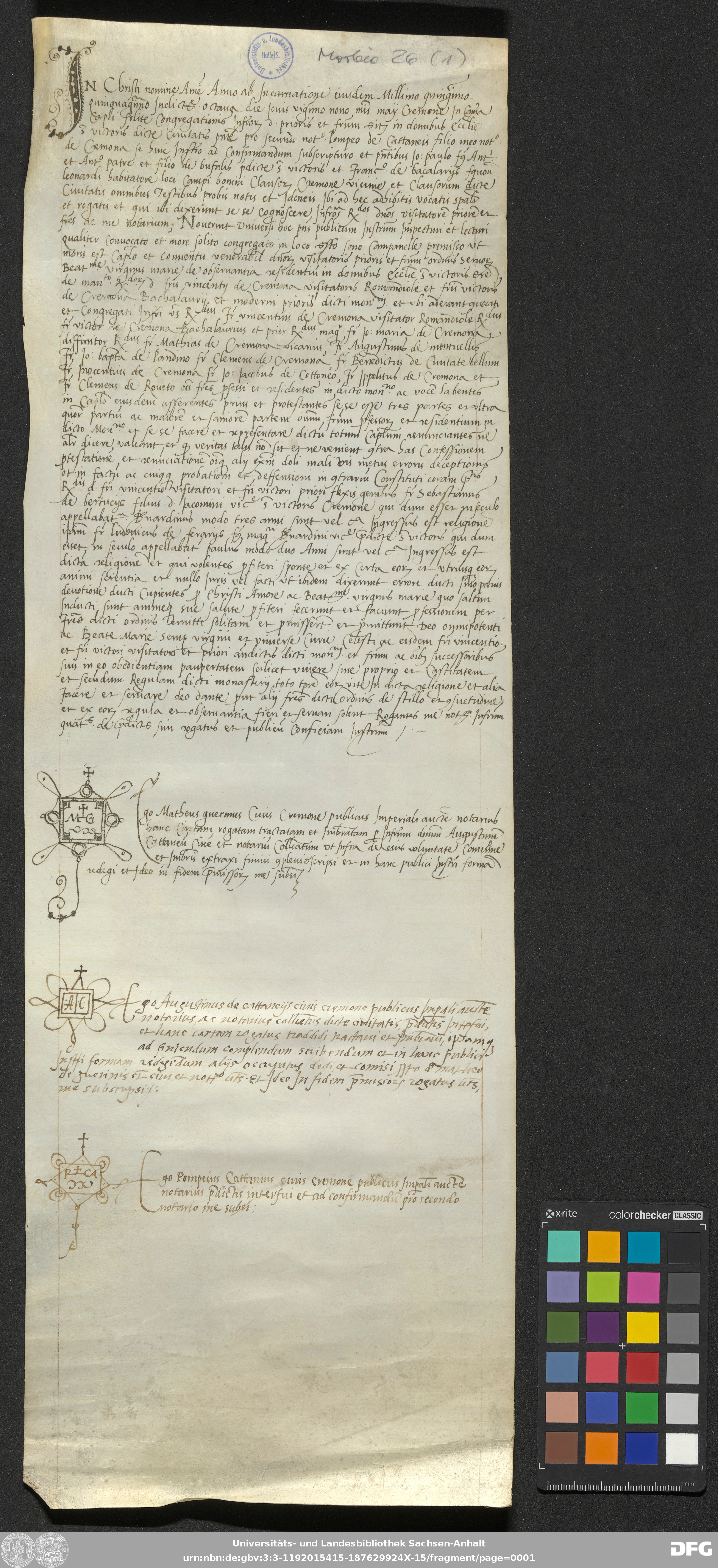 | Annotations: | Handschrift DE-3, GND 2024680-8, Signatur: Morbio 26 (1) Die Illustrationen sind: Initiale, Notarszeichen Beschreibstoff: Pergament Erhaltungszustand: gut Handschrift Urkunde |