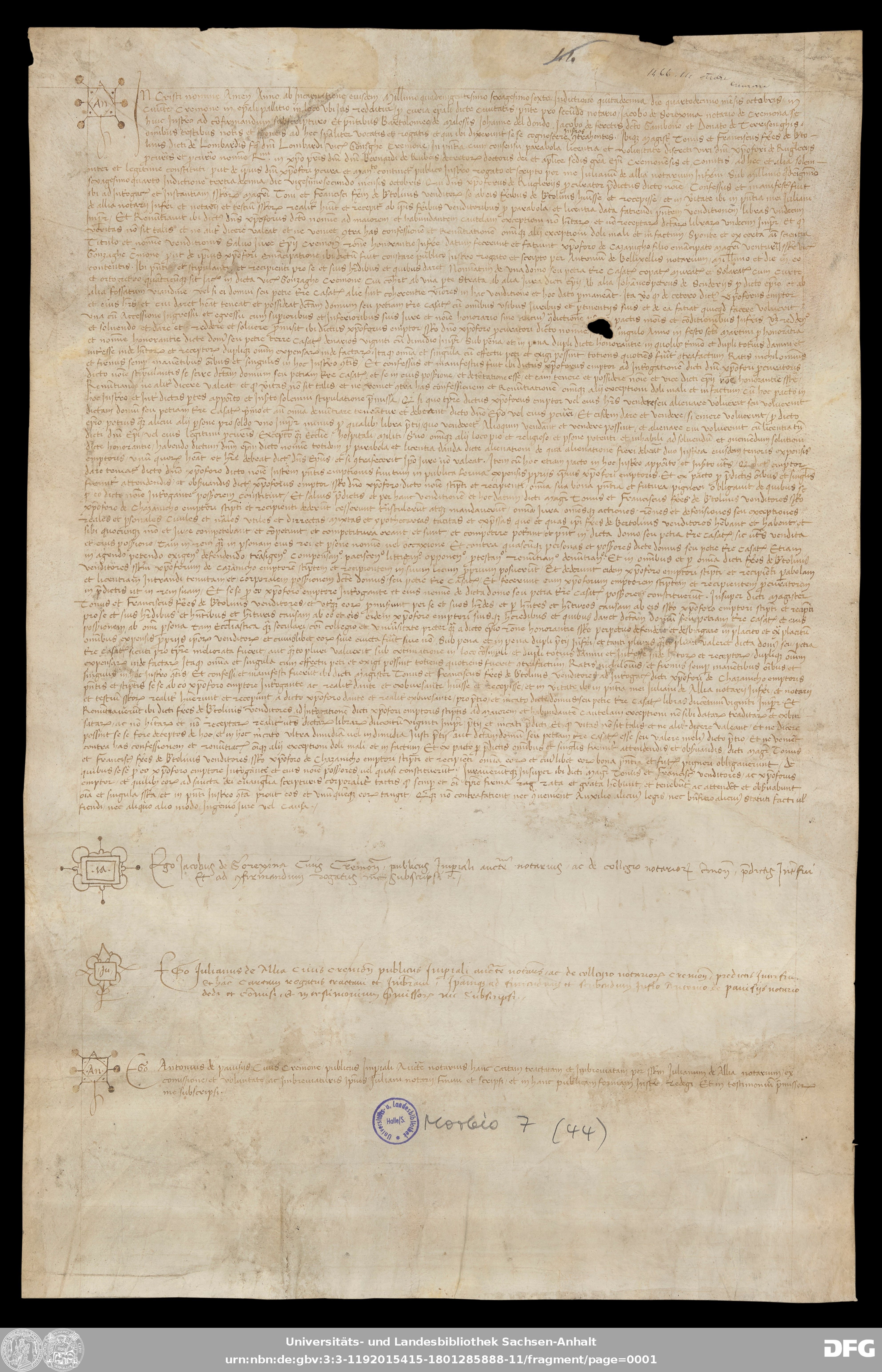 | Annotations: | Handschrift DE-3, GND 2024680-8, Signatur: Morbio 7 (44) Die Illustrationen sind: Notarszeichen Überlieferungsart: original Beschreibstoff: Pergament Erhaltungszustand: moderat Handschrift Urkunde |