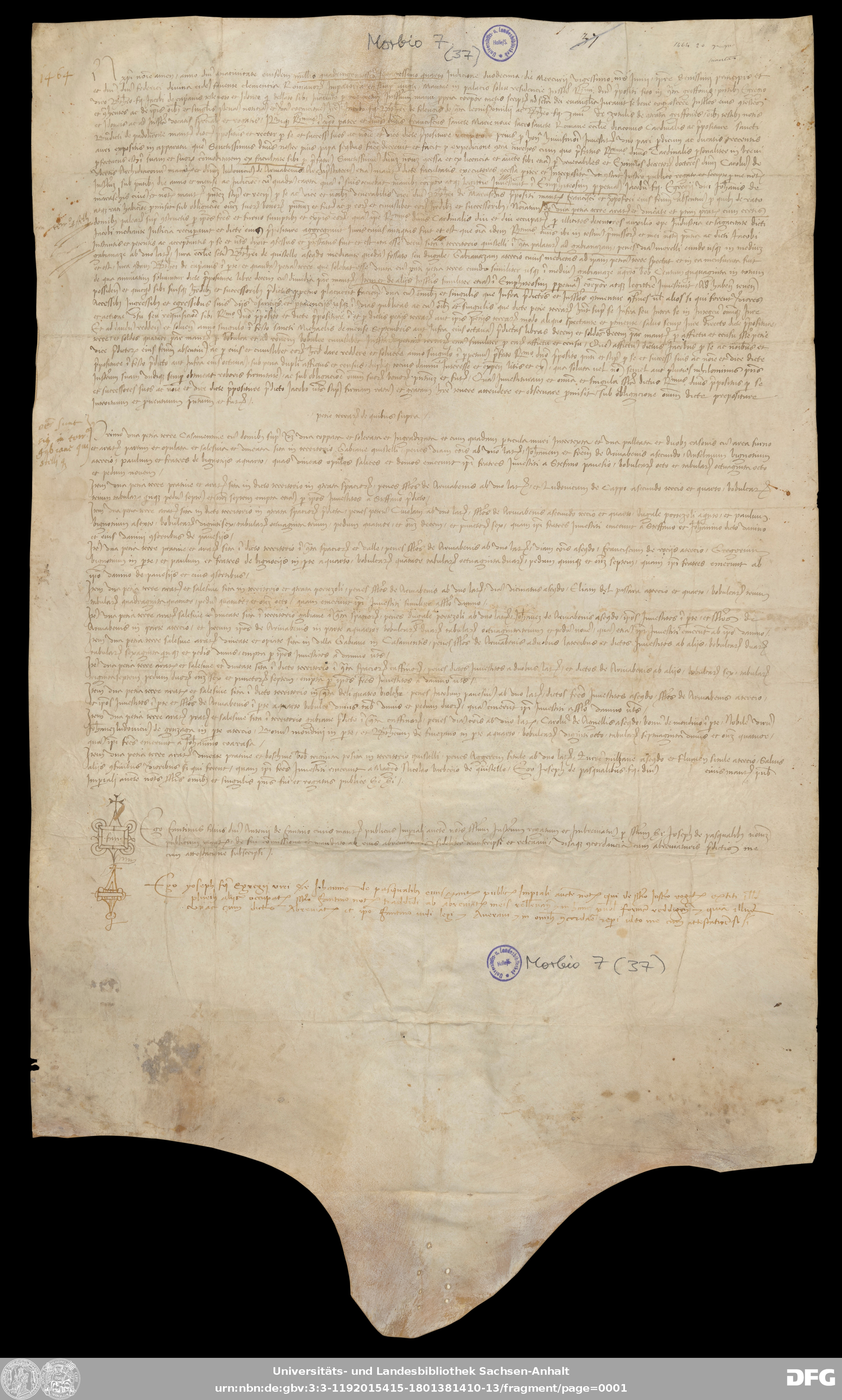 | Annotations: | Handschrift DE-3, GND 2024680-8, Signatur: Morbio 7 (37) Die Illustrationen sind: Notarszeichen Überlieferungsart: original Beschreibstoff: Pergament Erhaltungszustand: moderat Handschrift Urkunde |