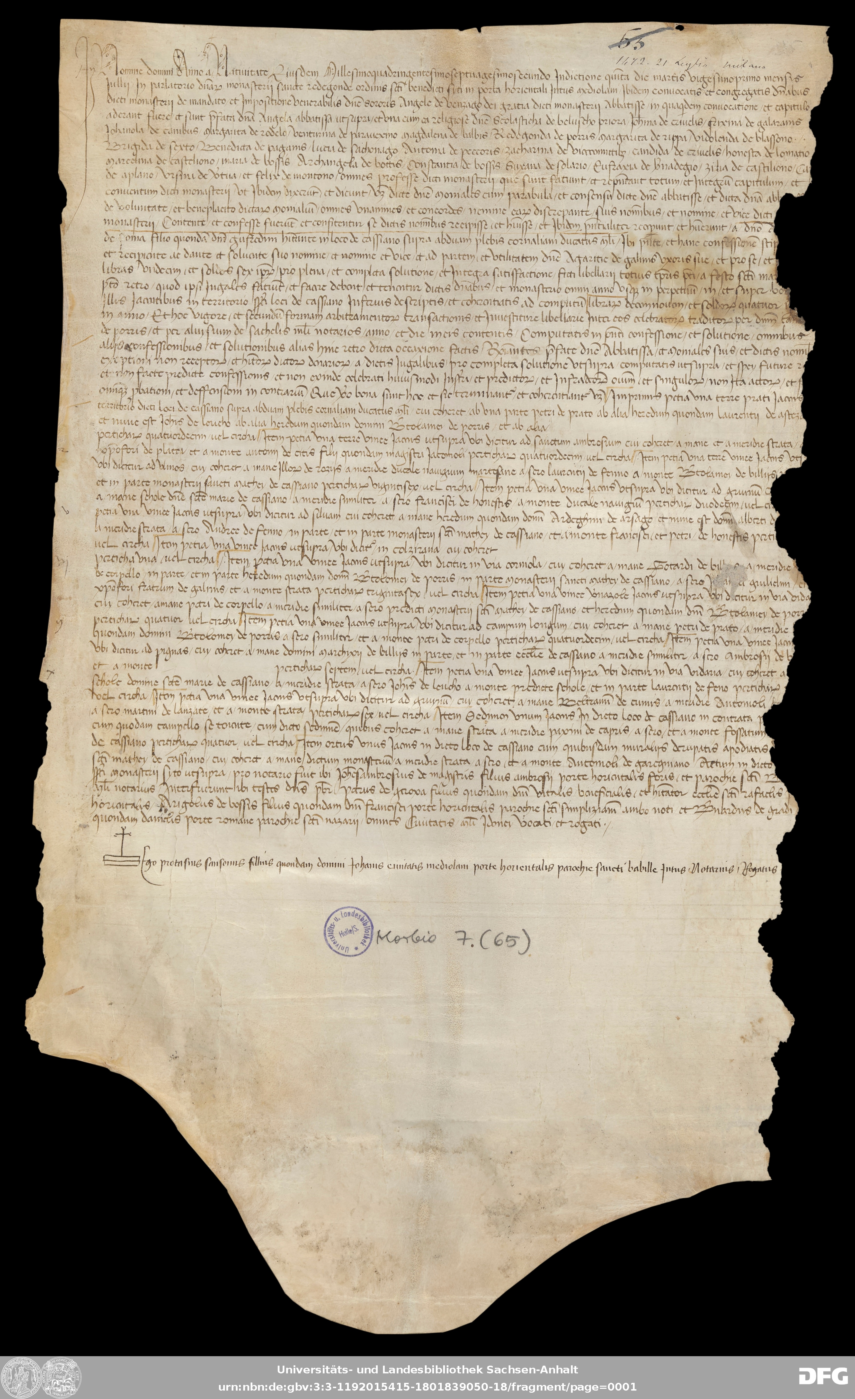 | Annotations: | Handschrift DE-3, GND 2024680-8, Signatur: Morbio 7 (65) Die Illustrationen sind: einzelne verzierte Buchstaben in der ersten Zeile, Notarszeichen Überlieferungsart: original Beschreibstoff: Pergament Erhaltungszustand: moderat Textverlust durch Beschädigung auf der rechten Seite des Bogens. Handschrift Urkunde |