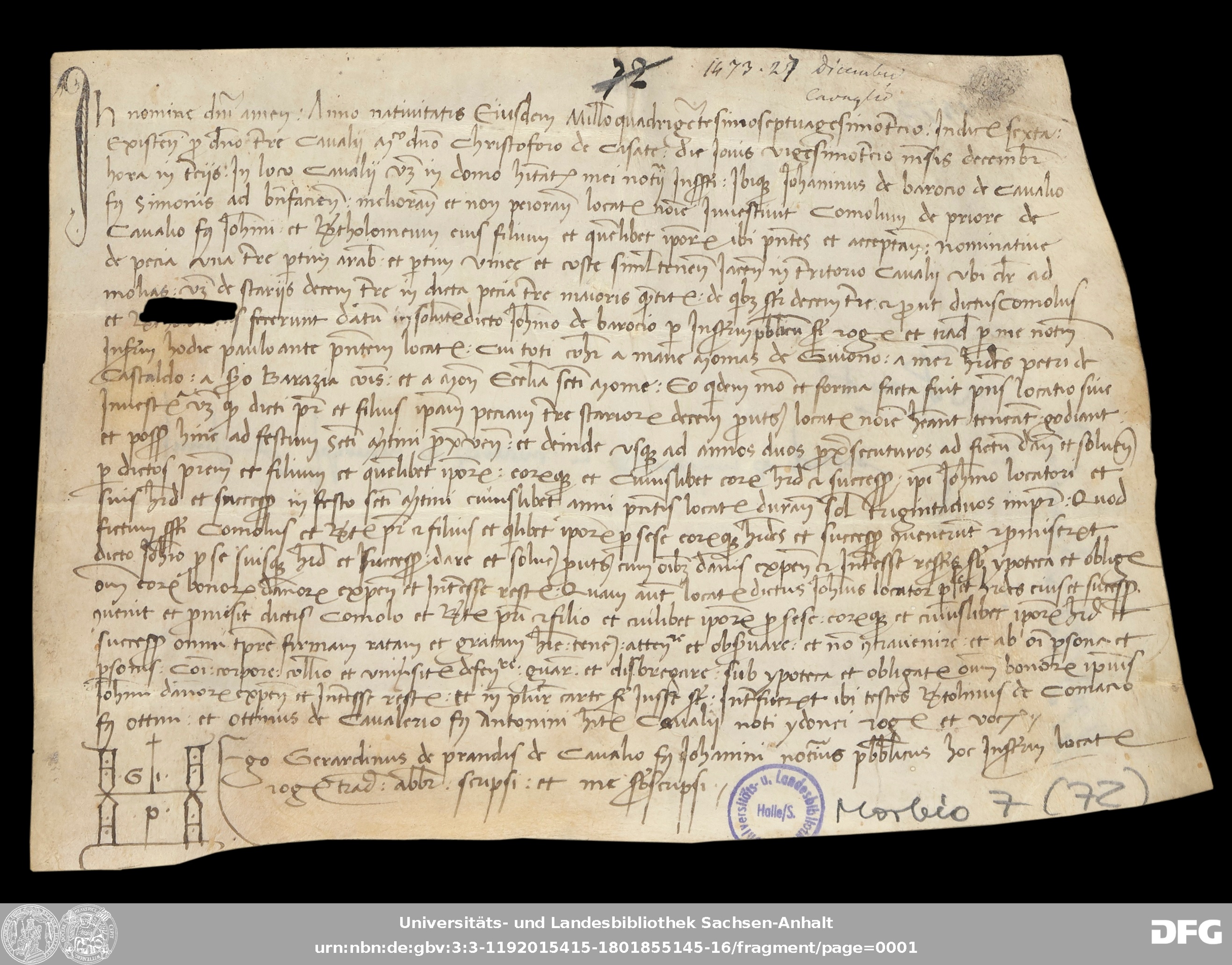 | Annotations: | Handschrift DE-3, GND 2024680-8, Signatur: Morbio 7 (72) Die Illustrationen sind: Initiale, Notarszeichen Überlieferungsart: original Beschreibstoff: Pergament Erhaltungszustand: moderat Handschrift Urkunde |