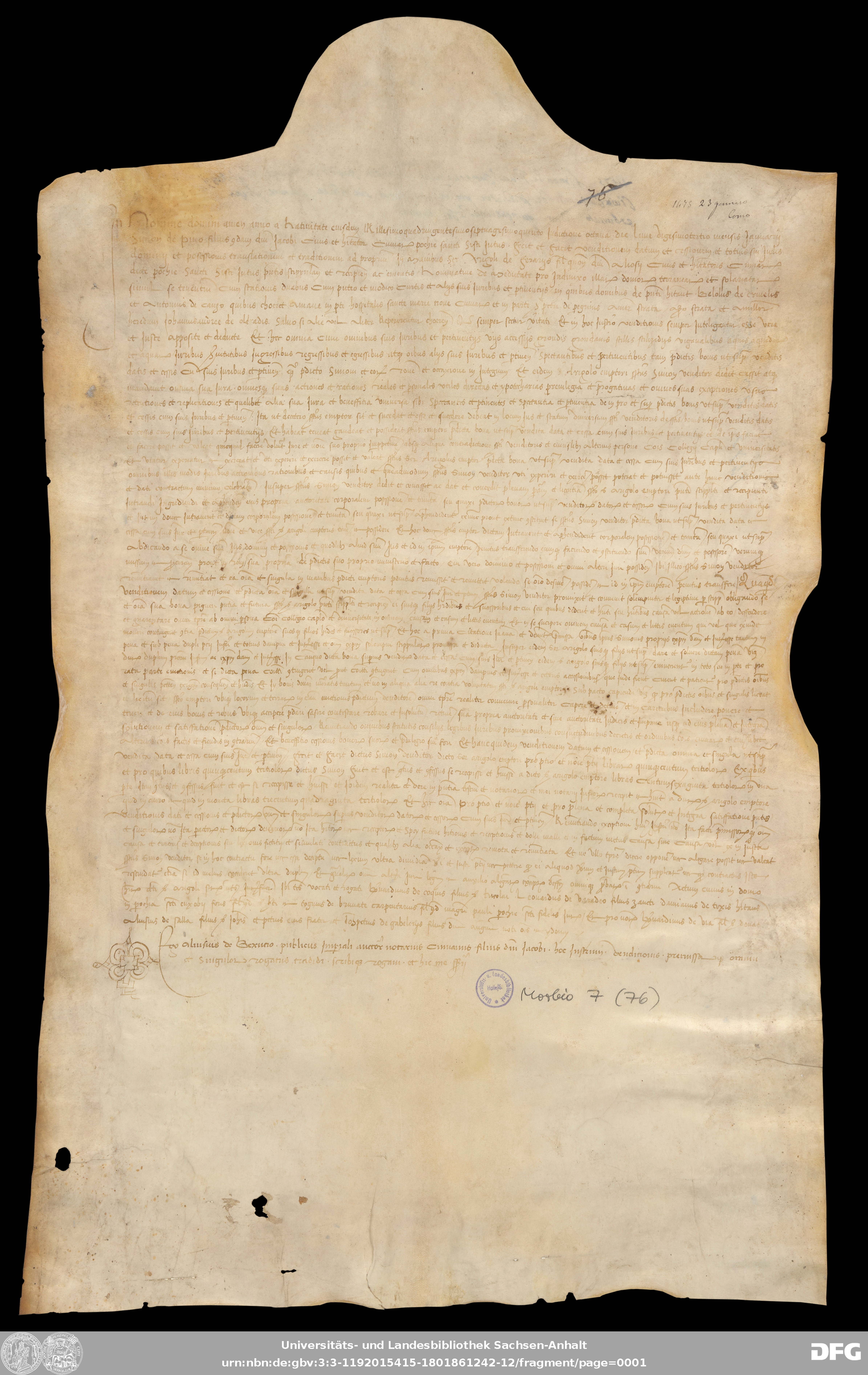 | Annotations: | Handschrift DE-3, GND 2024680-8, Signatur: Morbio 7 (76) Die Illustration ist: Notarszeichen Überlieferungsart: original Beschreibstoff: Pergament Erhaltungszustand: moderat Handschrift Urkunde |