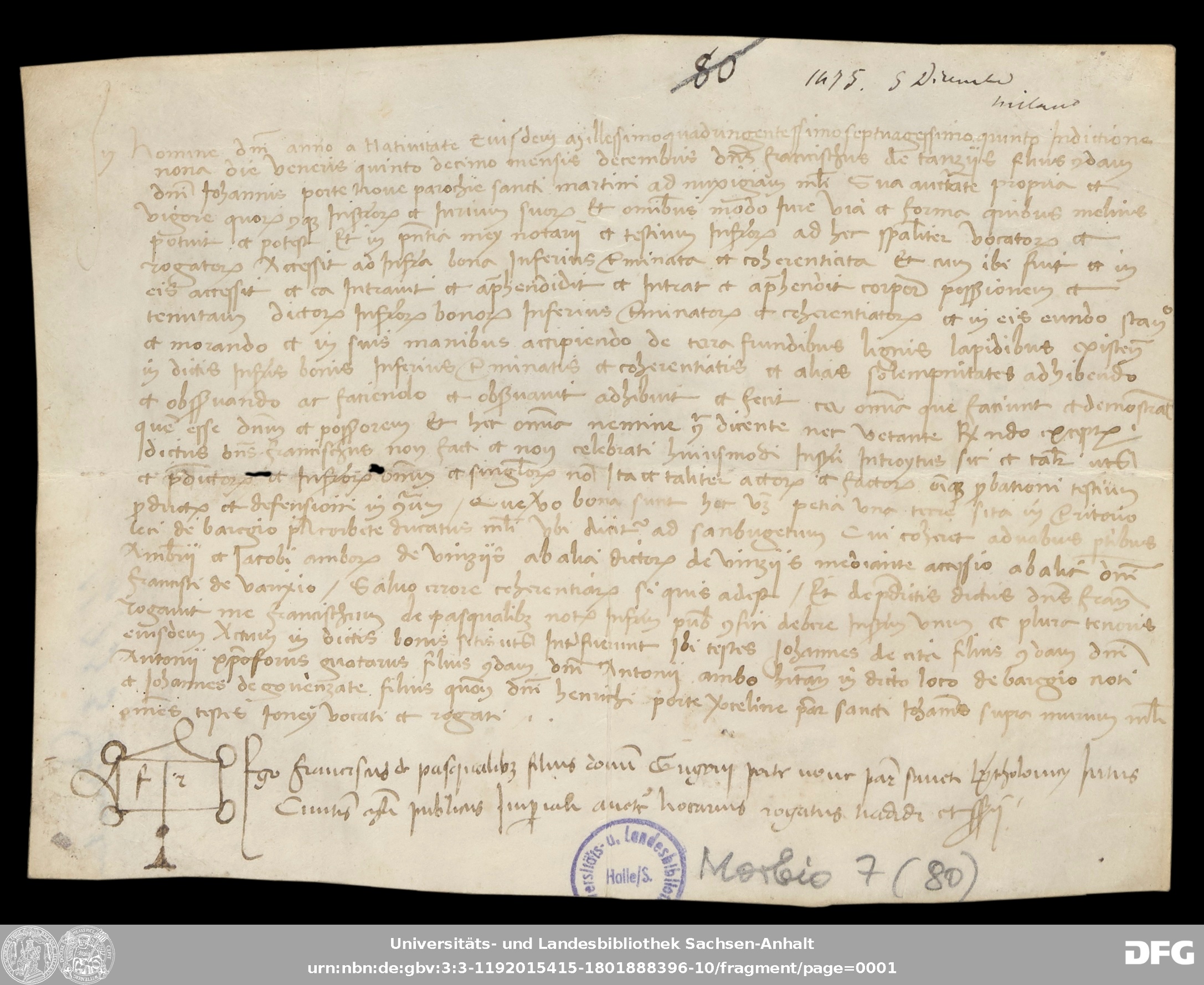 | Annotations: | Handschrift DE-3, GND 2024680-8, Signatur: Morbio 7 (80) Die Illustration ist: Notarszeichen Überlieferungsart: original Beschreibstoff: Pergament Erhaltungszustand: gut Handschrift Urkunde |