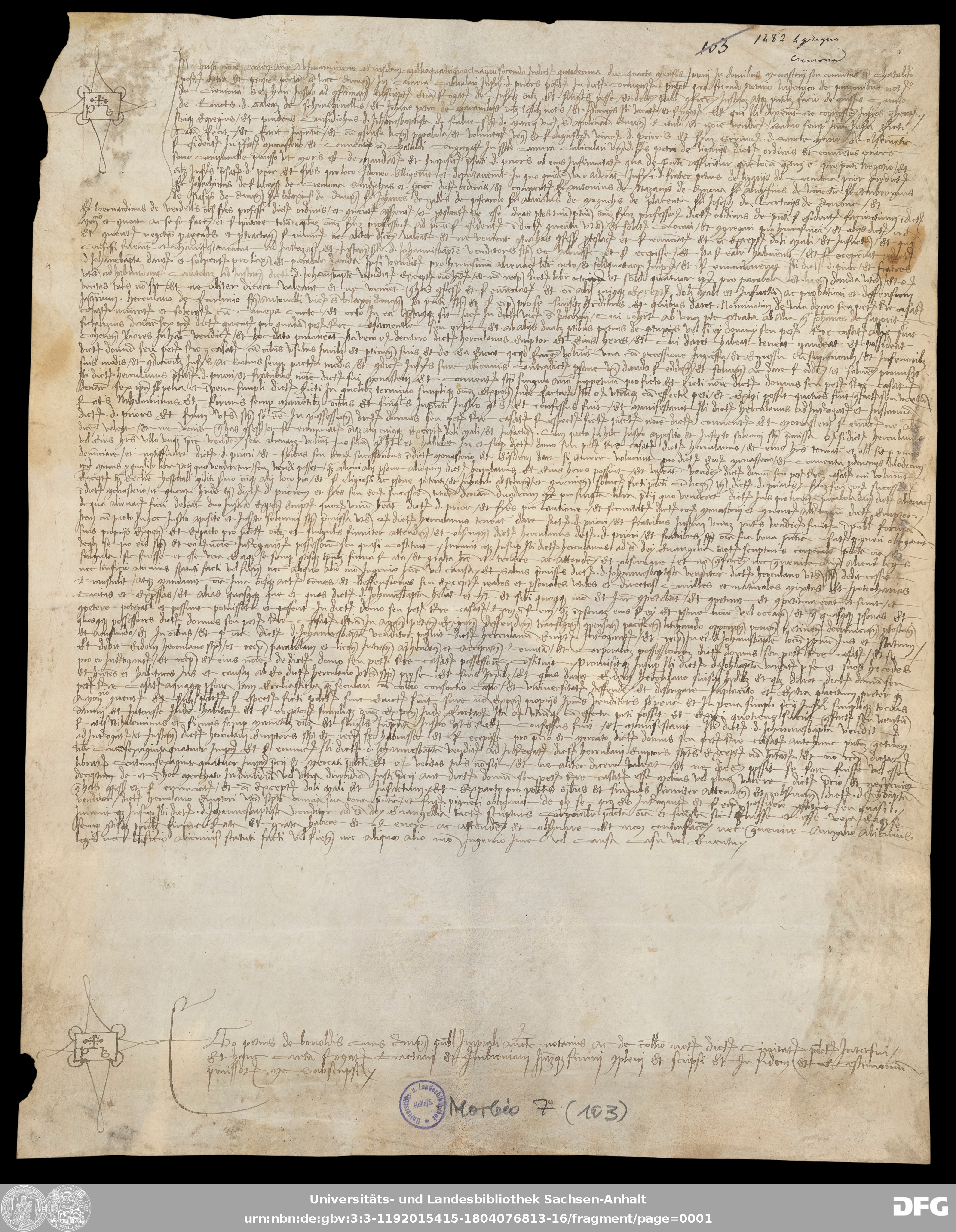| Annotations: | Handschrift DE-3, GND 2024680-8, Signatur: Morbio 7 (103) Die Illustrationen sind: Notarszeichen Überlieferungsart: original Beschreibstoff: Pergament Erhaltungszustand: moderat Handschrift Urkunde |