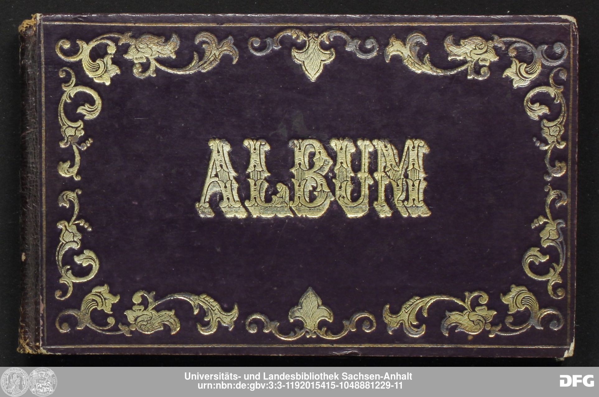 Einband: Ganzlederband; Leder über Pappe; Streicheisenlinien; Rollenstempel (Goldprägung); Rückenprägung mit Rollenstempel (Goldprägung; Blindstempel); Vorderdeckel mit goldgeprägtem Titel: Album; Goldschnitt; fliegende Blätter aus Buntpapier.