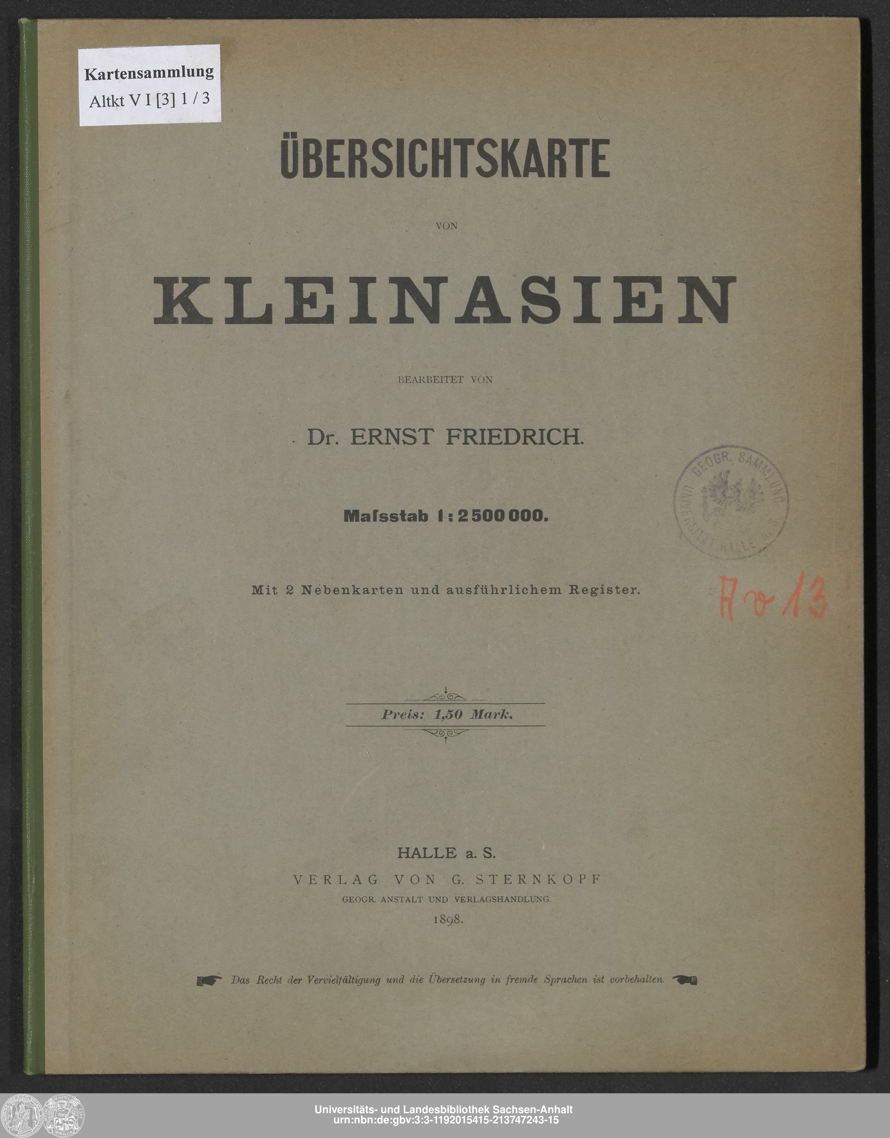 | Published: | Halle a.S. : Verlag von G. Sternkopf, Geogr. Anstalt und Verlagshandlung, 1898 |