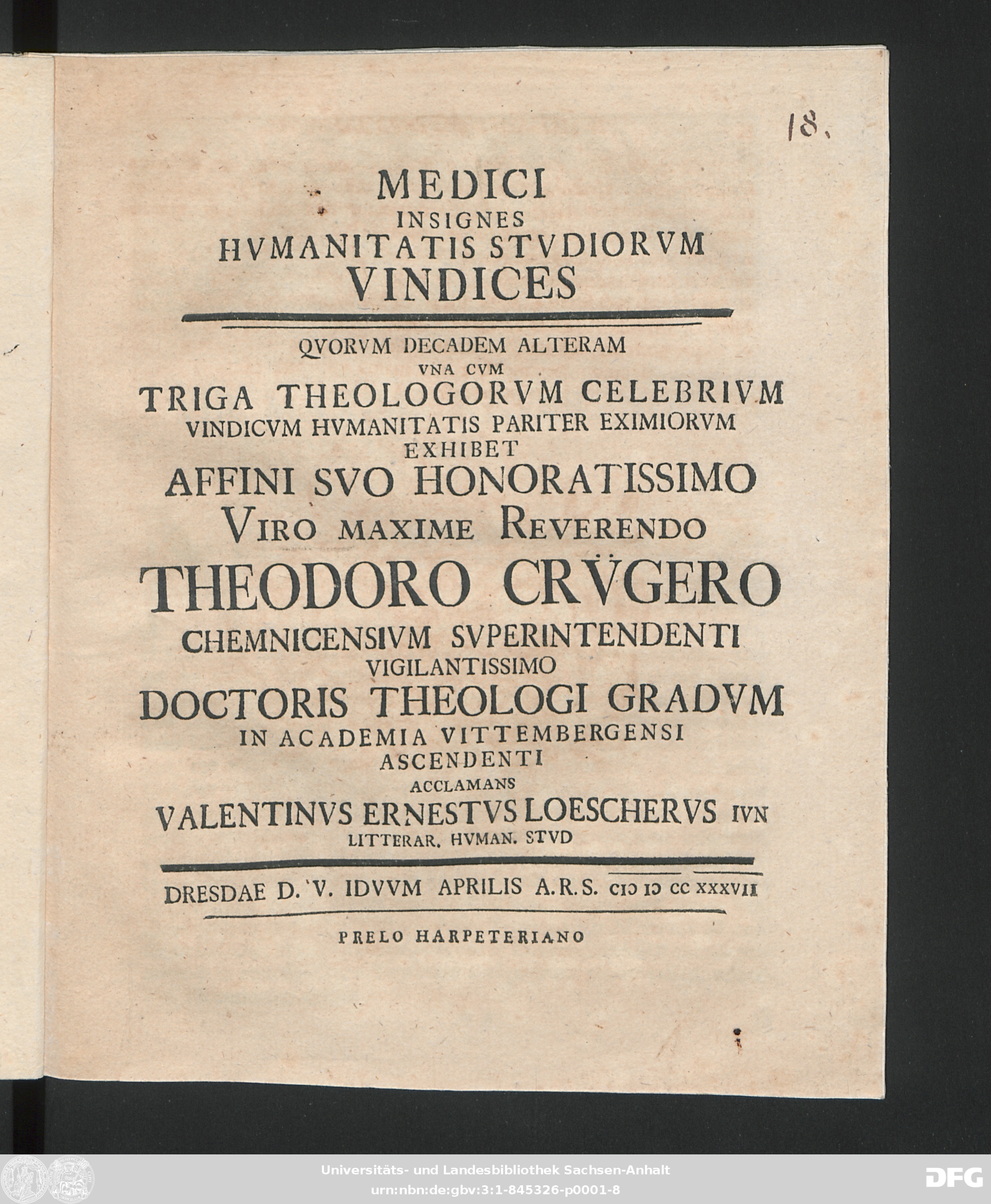 | Part: | 2 : Vna Cvm Triga Theologorvm Celebrivm Vindicvm Hvmanitatis Pariter Eximirovm Exhibet Affini Svo Honoratissimo Viro Maxime Reverendo Theodoro Crv̈gero Chemnicensivm Svperintendenti Vigilantissimo Doctoris Theologi Gradvm In Academia Vittembergensi Ascendenti Acclamans Valentinvs Ernestvs Loeschervs Ivn Litterar. Hvman. Stvd : Dresdae D. V. Idvvm Aprilis A. R. S. MDCCXXXVII |