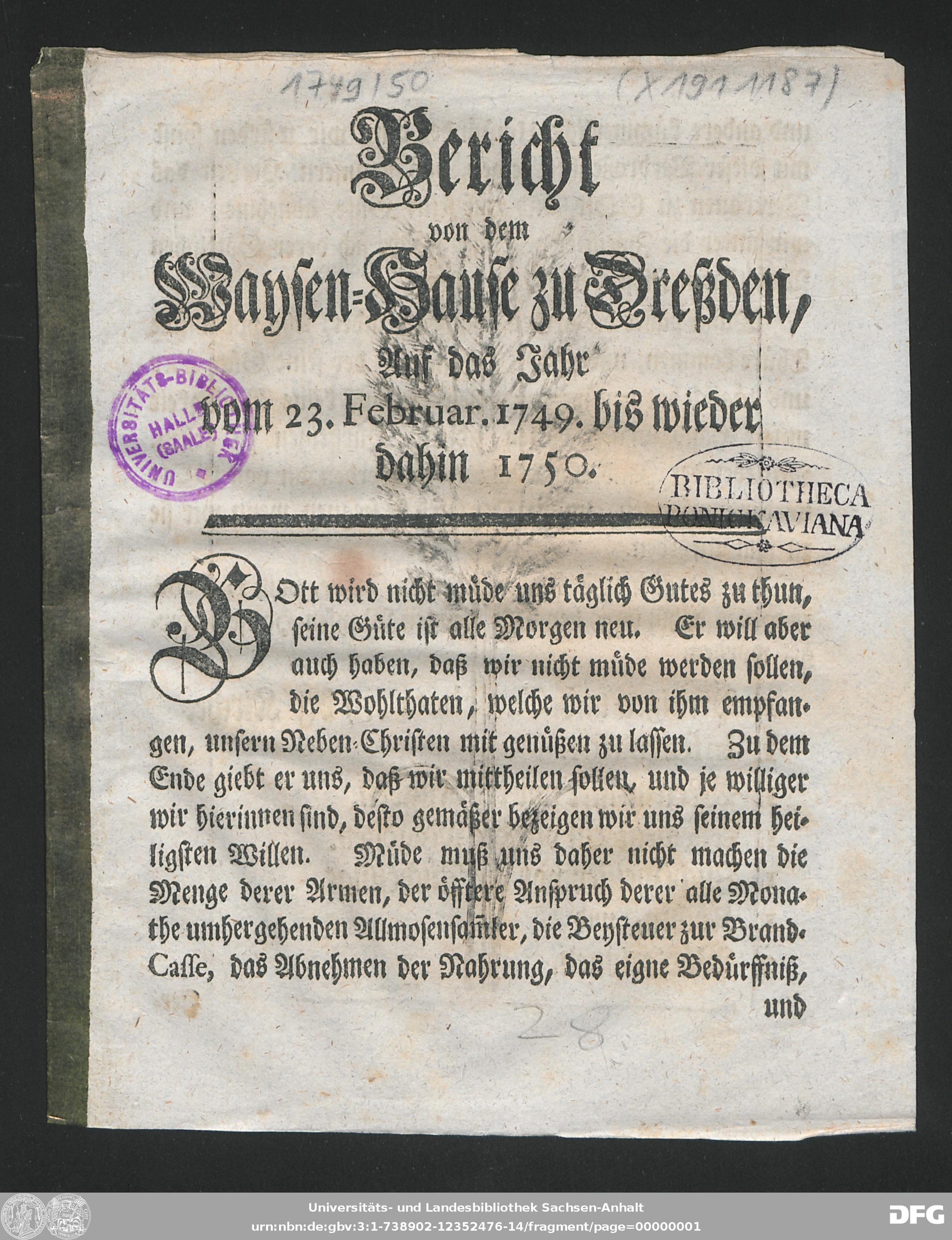 http://dx.doi.org/10.25673/90370| Title: | Bericht von dem Waisenhause zu Dresden : aufs Jahr ... |