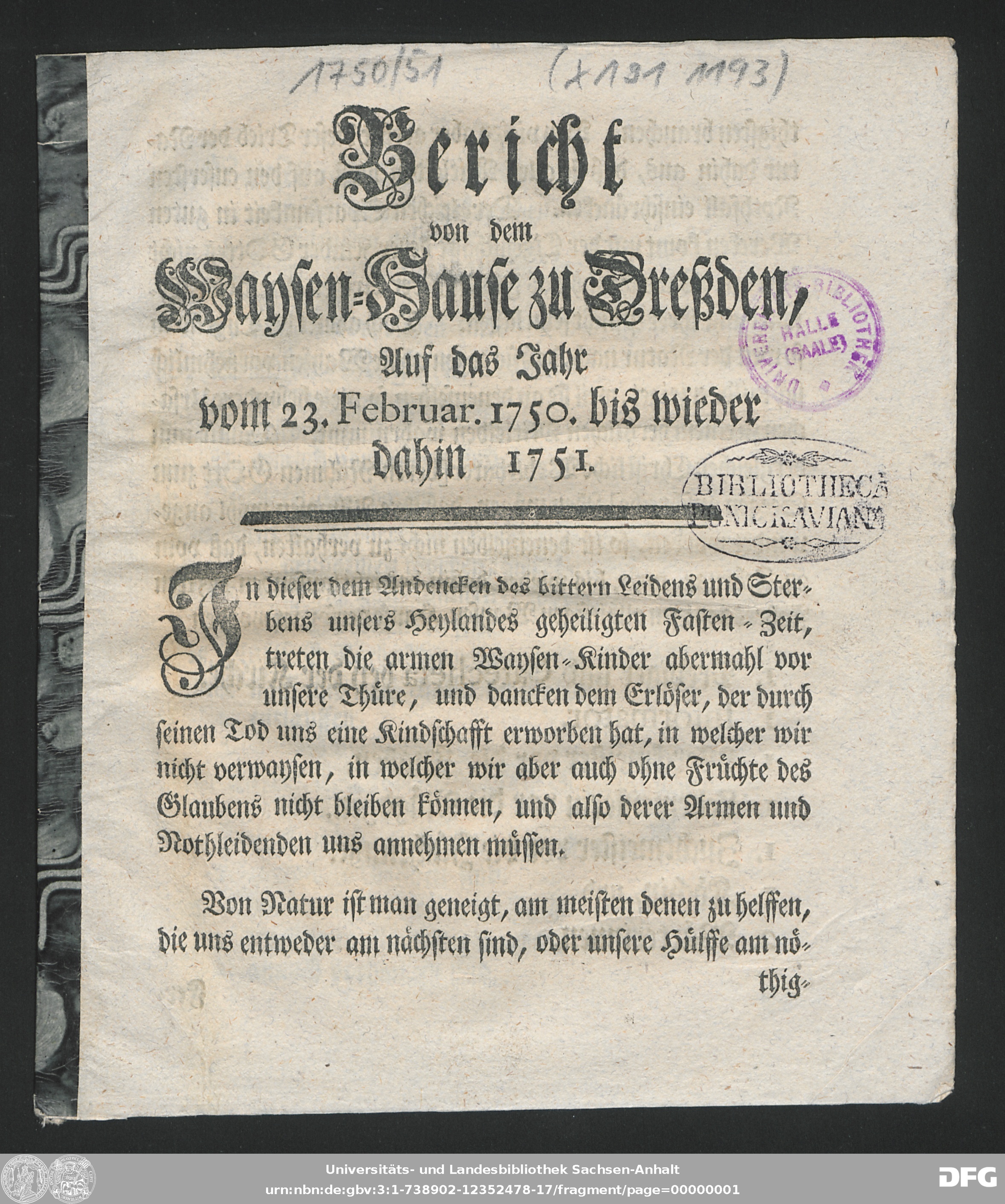 http://dx.doi.org/10.25673/90371| Title: | Bericht von dem Waisenhause zu Dresden : aufs Jahr ... |