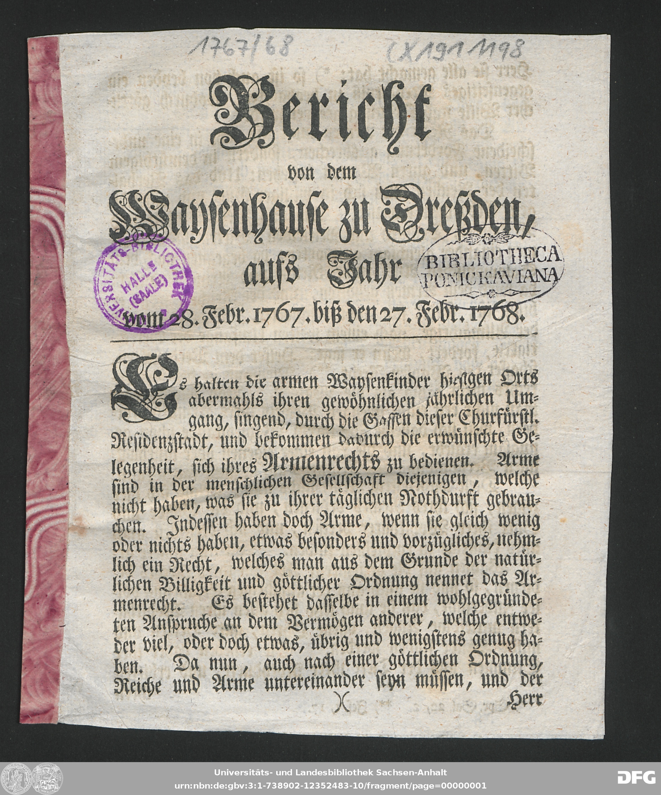 http://dx.doi.org/10.25673/90376| Title: | Bericht von dem Waisenhause zu Dresden : aufs Jahr ... |