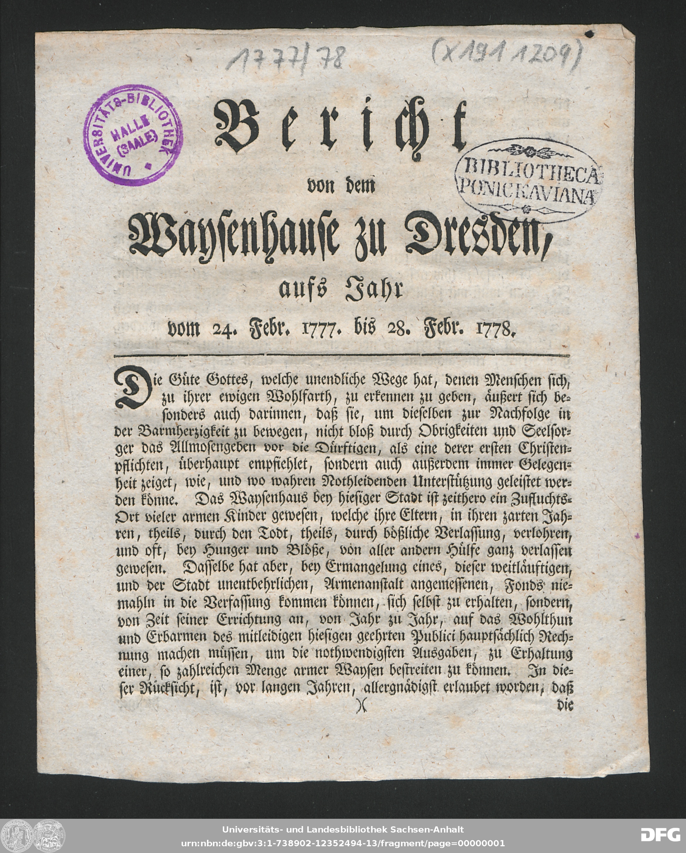 http://dx.doi.org/10.25673/90389| Title: | Bericht von dem Waisenhause zu Dresden : aufs Jahr ... |