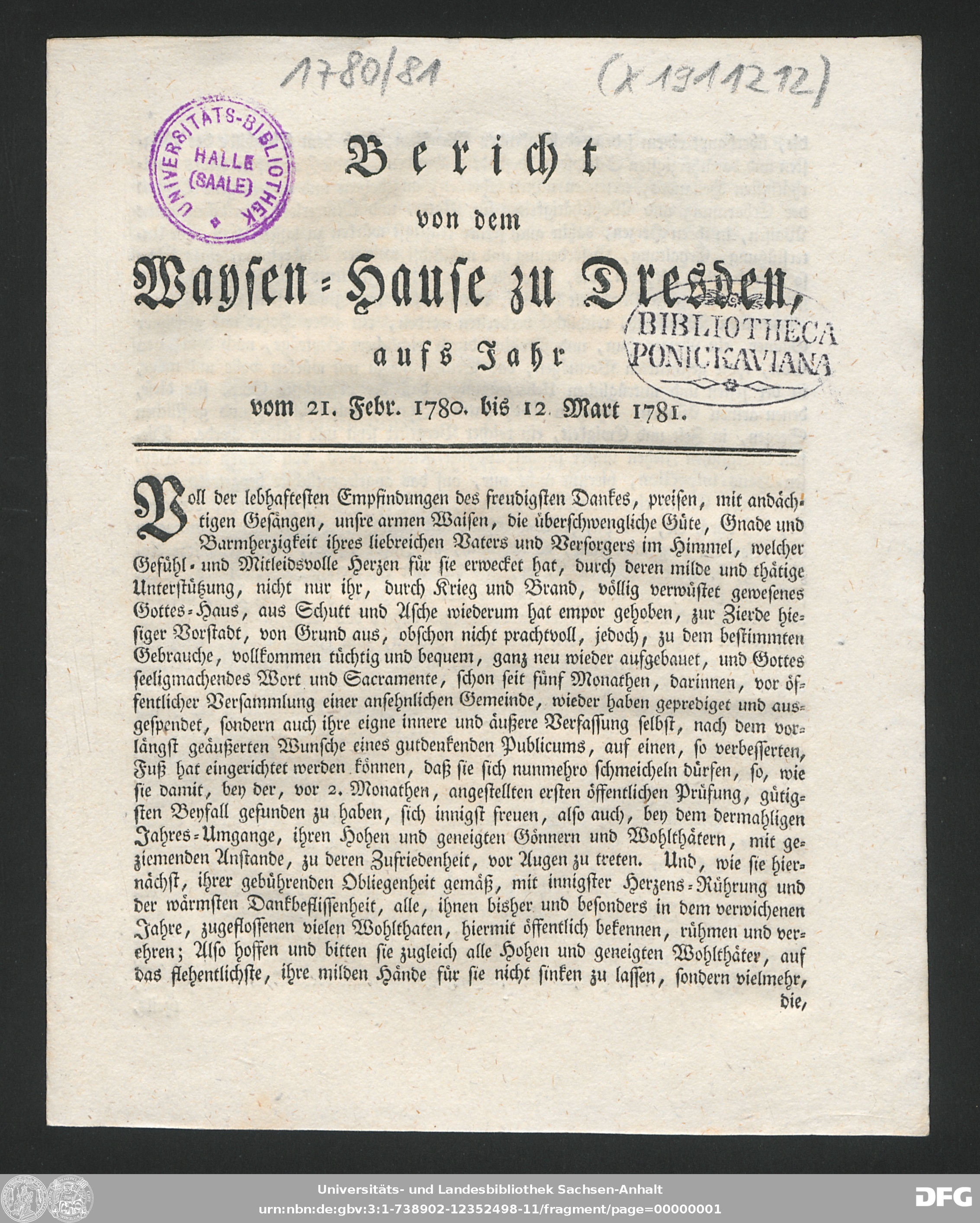 http://dx.doi.org/10.25673/90395| Title: | Bericht von dem Waisenhause zu Dresden : aufs Jahr ... |