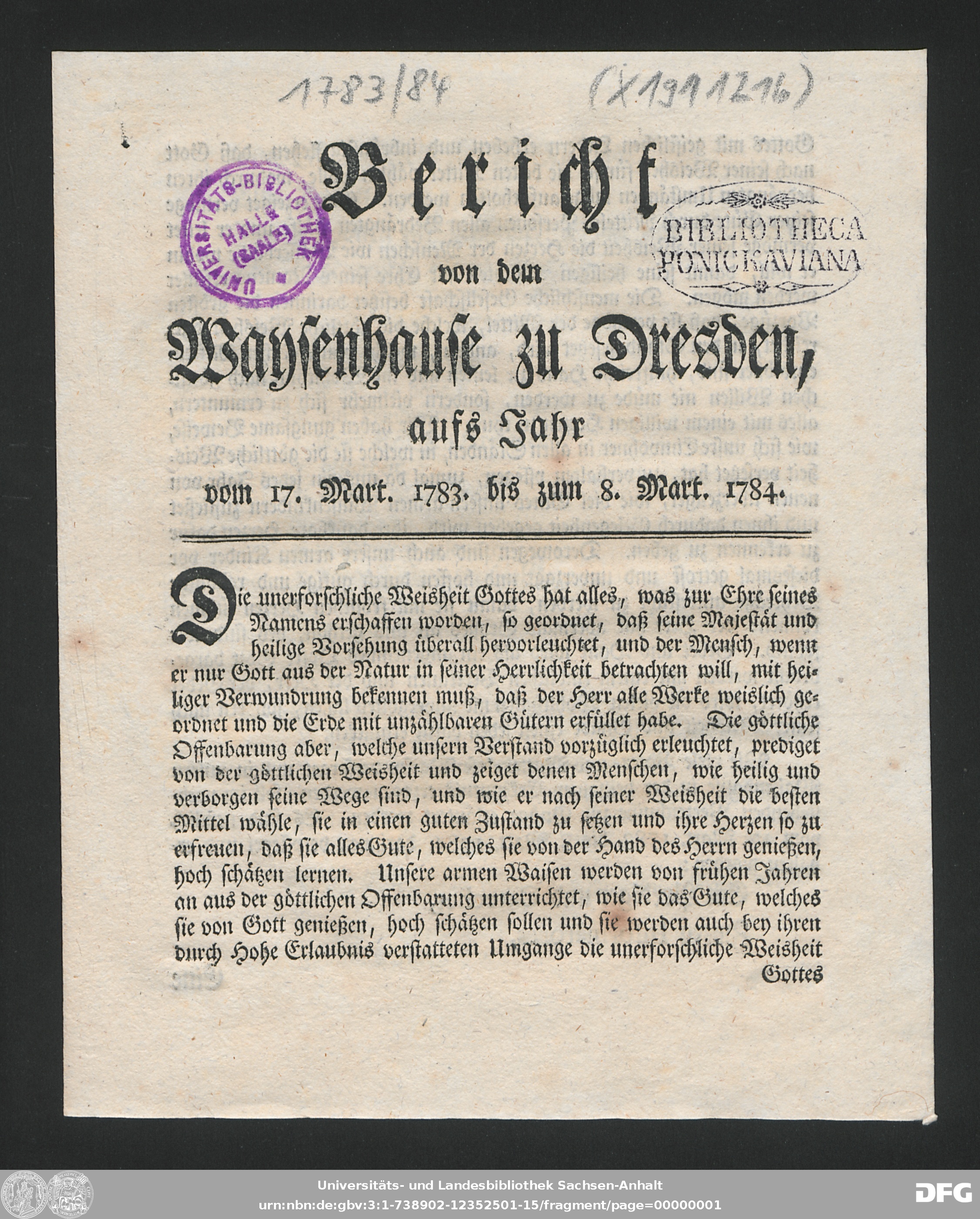 http://dx.doi.org/10.25673/90398| Title: | Bericht von dem Waisenhause zu Dresden : aufs Jahr ... |