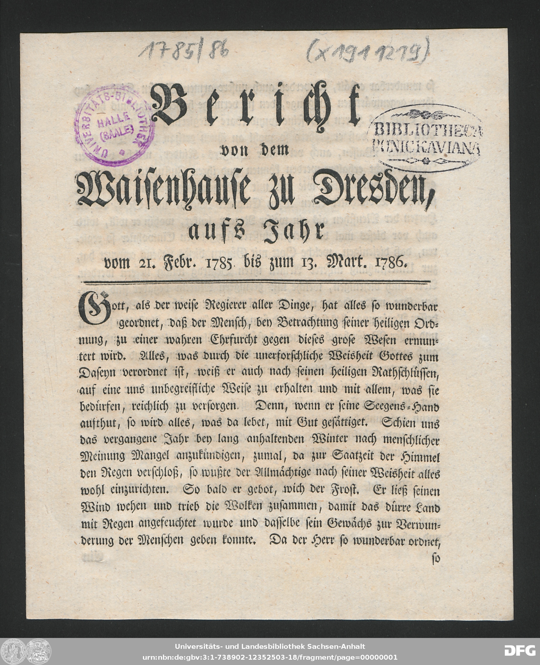 http://dx.doi.org/10.25673/90400| Title: | Bericht von dem Waisenhause zu Dresden : aufs Jahr ... |