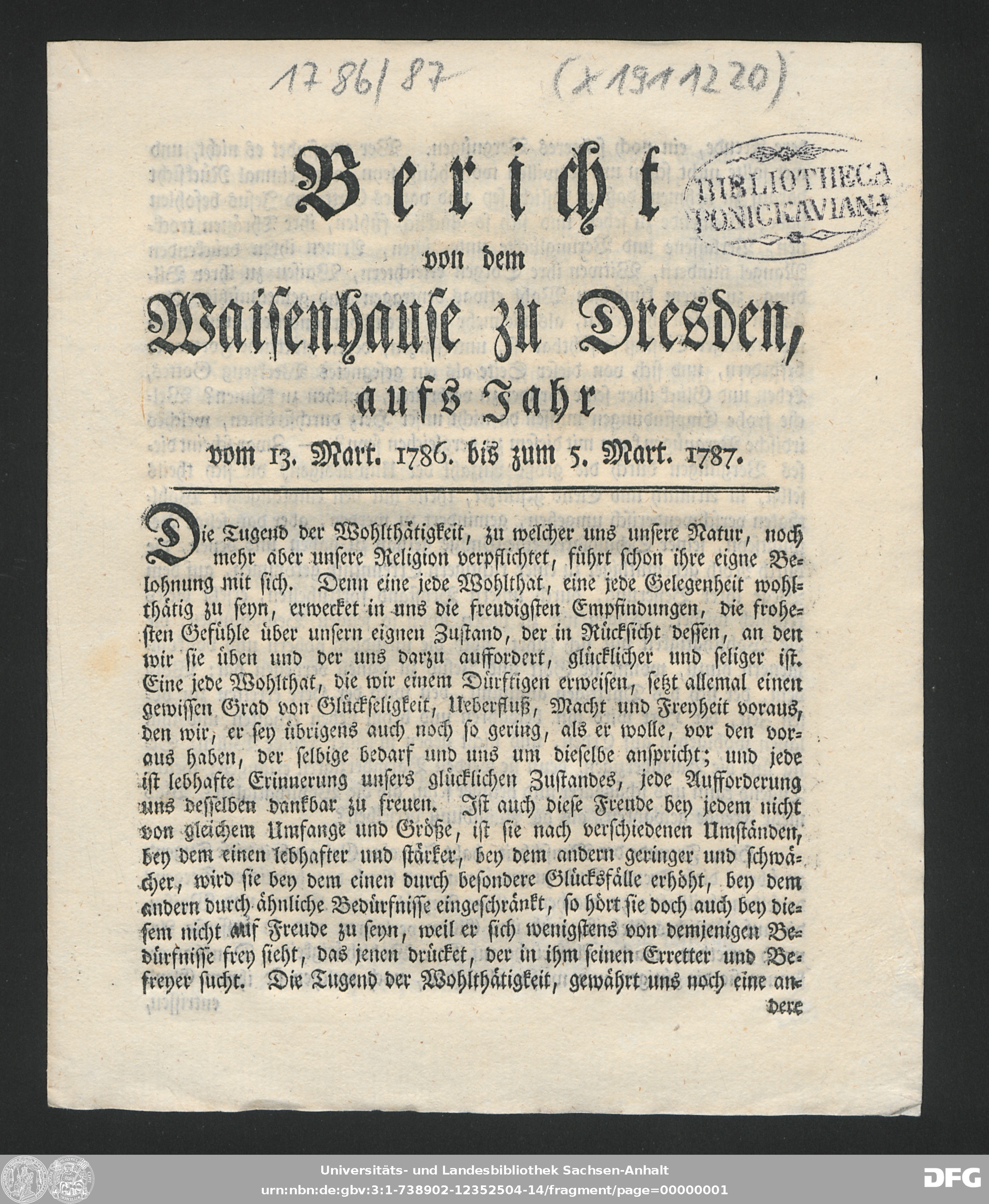 http://dx.doi.org/10.25673/90401| Title: | Bericht von dem Waisenhause zu Dresden : aufs Jahr ... |