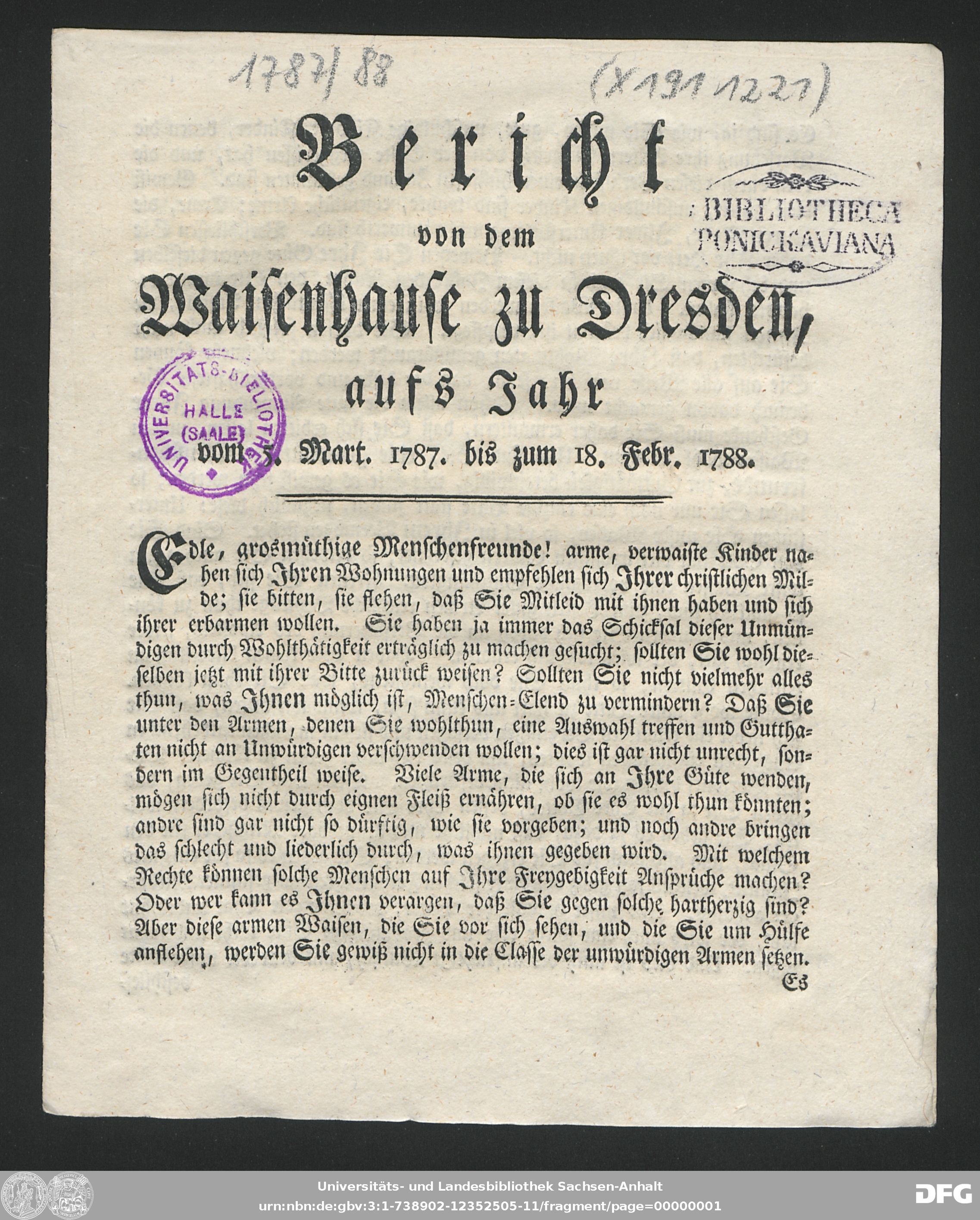 http://dx.doi.org/10.25673/90402| Title: | Bericht von dem Waisenhause zu Dresden : aufs Jahr ... |