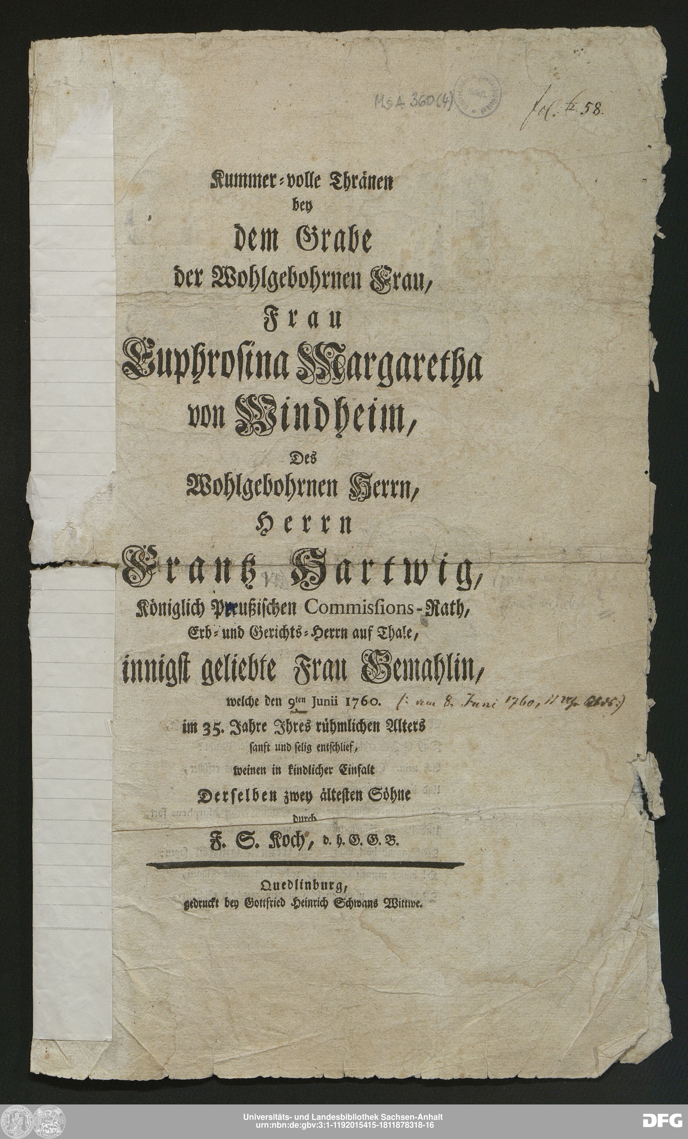 http://dx.doi.org/10.25673/91081| Title: | Kummer-volle Thränen bey dem Grabe der Wohlgebohrnen Frau, Frau Euphrosina Margaretha von Windheim, Des Wohlgebohrnen Herrn, Herrn Frantz Hartwig, Königlich Preußischen Commissions-Rath, Erb- und Gerichts-Herrn auf Thale, innigst geliebete Frau Gemahlin, welche den 9ten Junii 1760. im 35. Jahre Jhres rühmlichen Alters sanft und selig entschlief, weinen in kindlicher Einfalt Derselben zwey ältesten Söhne / durch F. S. Koch, d.h.G.G.B. |