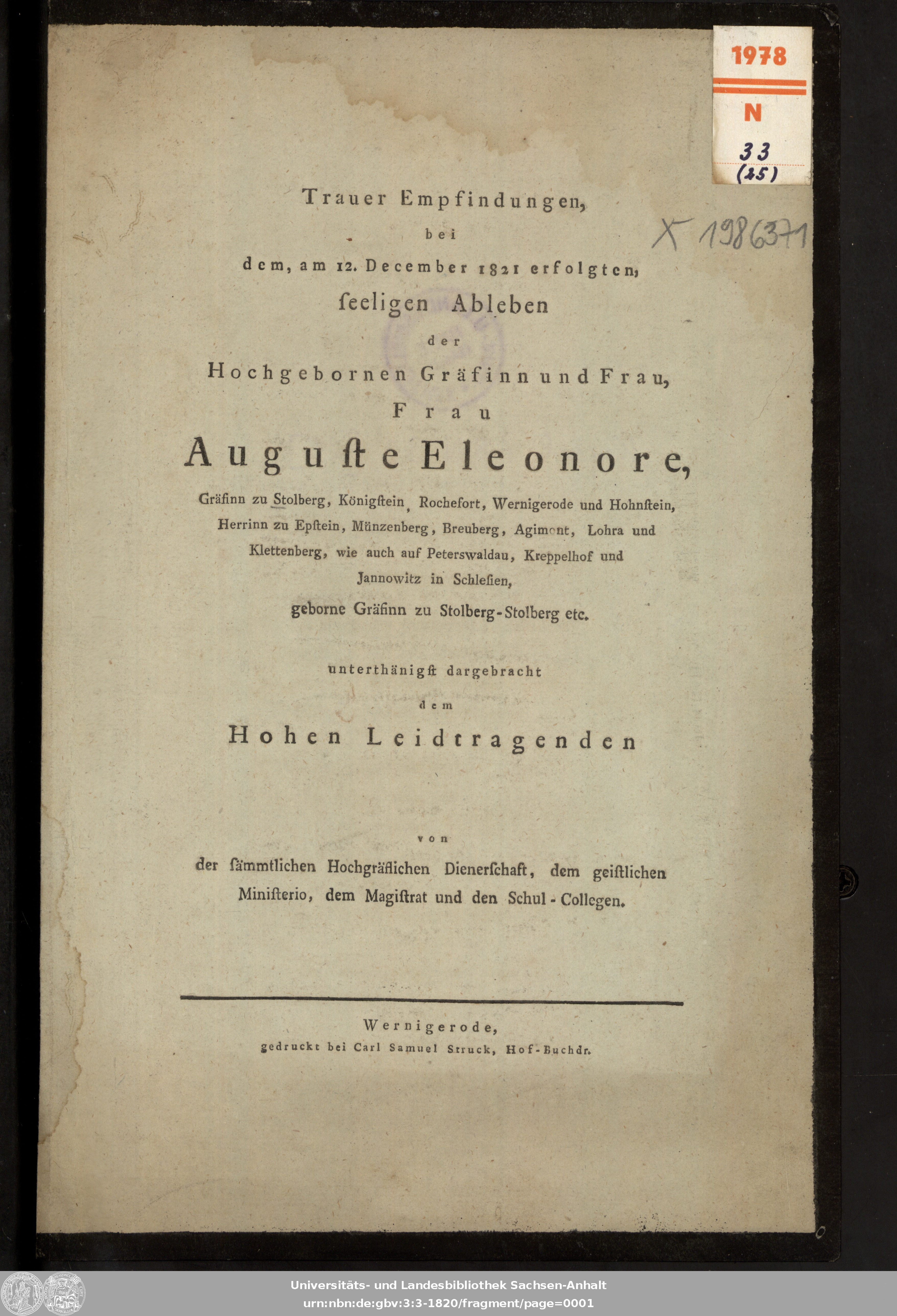 Title: Trauer Empfindungen, bei dem, am 12. December 1821 erfolgten, seeligen Ableben der Hochgebornen Gräfinn und Frau, Frau Auguste Eleonore, Gräfinn zu Stolberg, Königstein, Rochefort, Wernigerode und Hohnstein, Herrinn zu Epstein, Münzenberg, Breuberg, Agimont, Lohra und Klettenberg, wie auch auf Peterswaldau, Kreppelhof und Jannowitz in Schlesien, geborne Gräfinn zu Stolberg-Stolberg etc. / unterthänigst dargebracht dem Hohen Leidtragenden von der sämmtlichen Hochgräflichen Dienerschaft, dem geistlichen Ministerio, dem Magistrat und den Schul-Collegen
